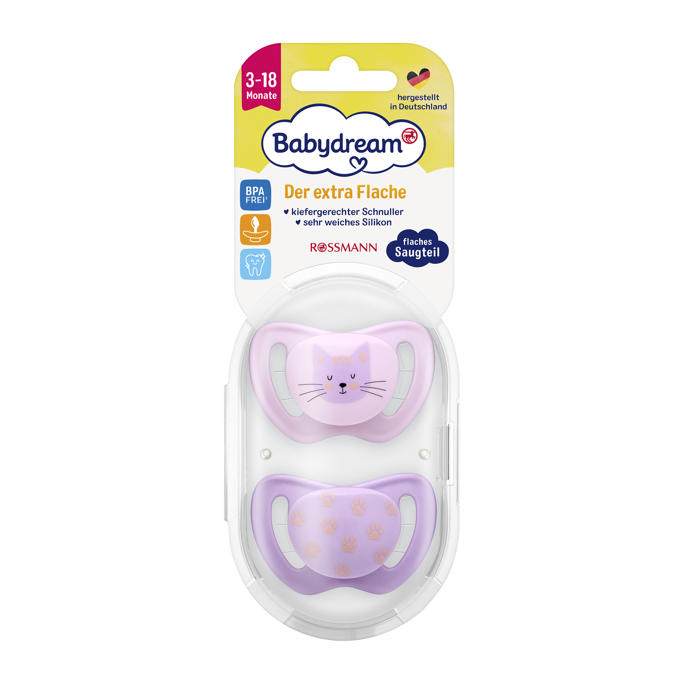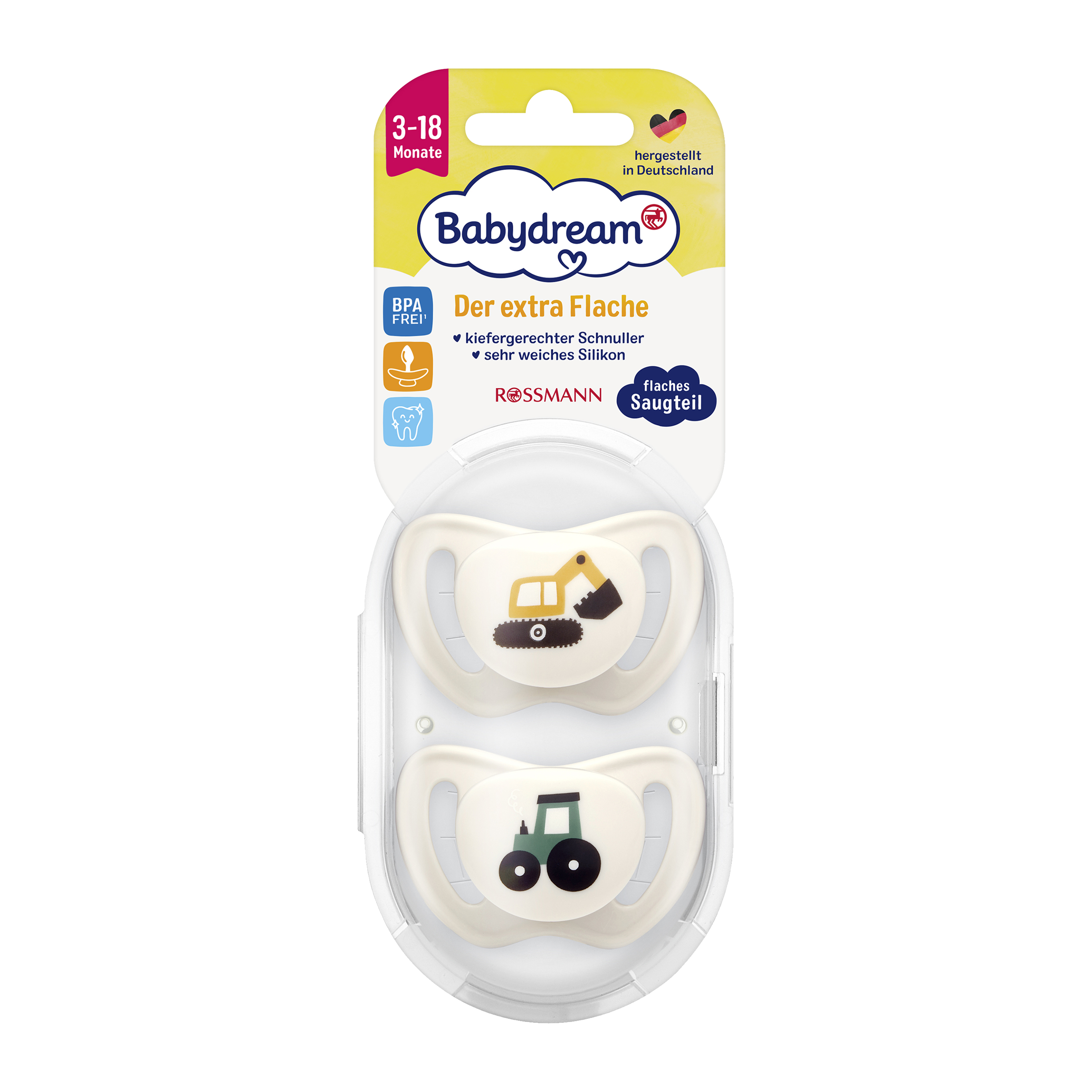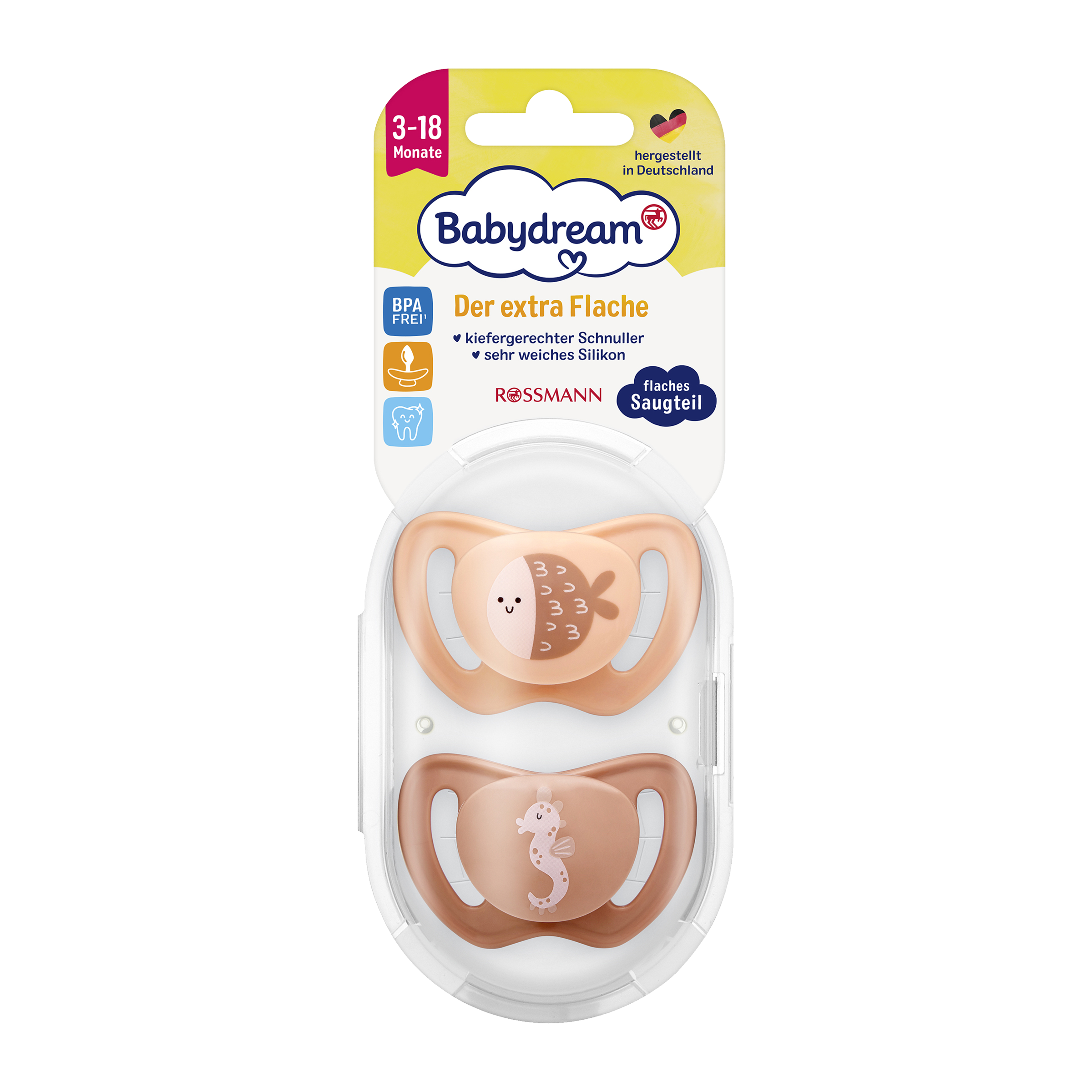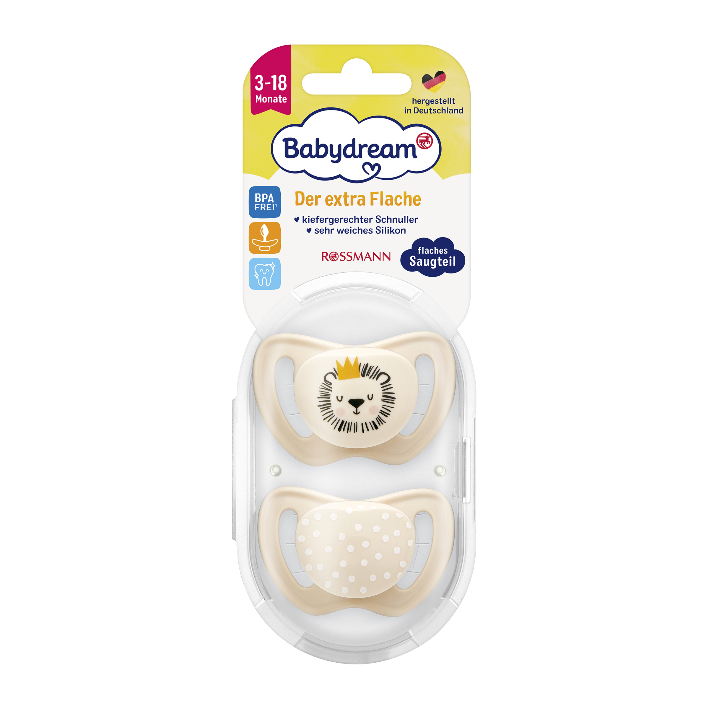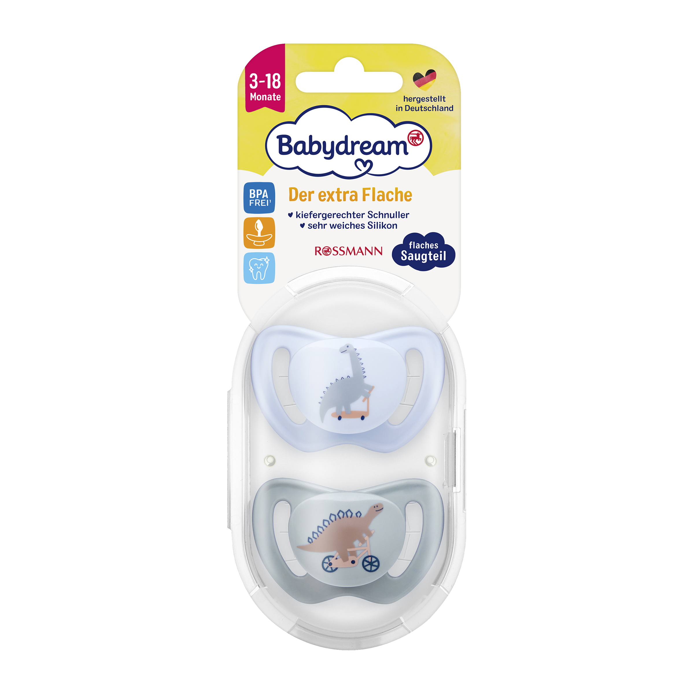 - Extra ploché: Zatímco u běžných dudlíků je dřík dudlíku silný 8 mm, náš dudlík je navržen jako mimořádně plochý, jen 5 mm, minimalizuje tak tlak na čelist a zuby.