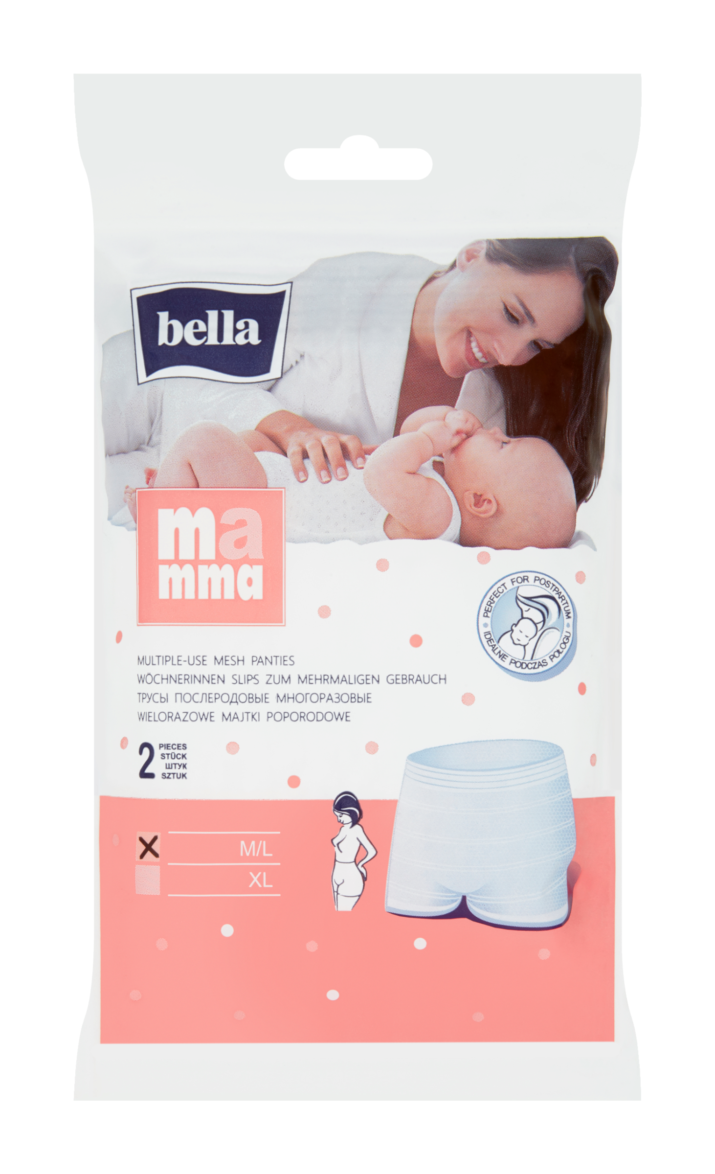 Multifunkční síťové kalhotky Bella Mamma. Vyrobeny z síťoviny, zajišťující cirkulaci vzduchu. Jemné fixační kalhotky se širokými lemy výrazně zvyšují uživatelský komfort, neškrtí a nezařezávají se. Mají boční švy na vnější straně, čímž chrání pokožku před vznikem podráždění. Výborně se přizpůsobí tvaru těla. Vhodné pro použití s porodnickými vložkami Bella Mamma.
