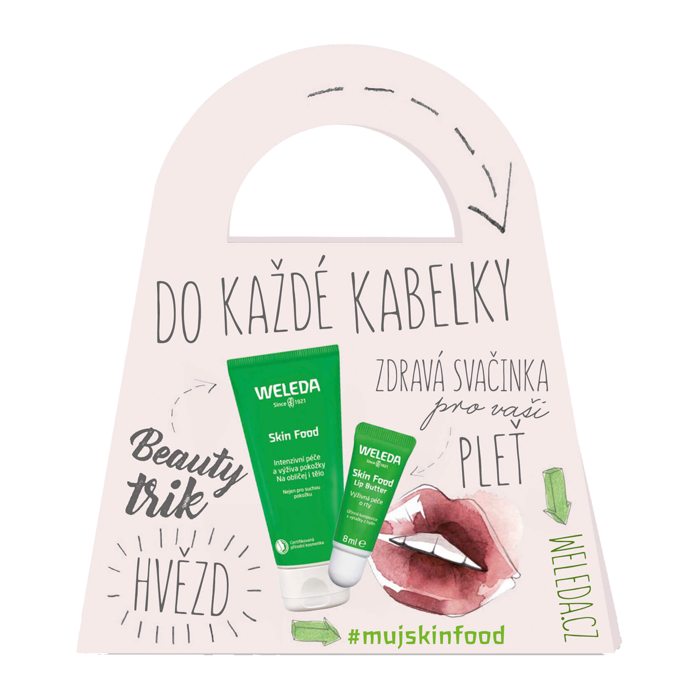 Malé balení multifunkčního krému Skin Food a pečující balzám Skin Food Lip Butter jsou kosmetickými nezbytnostmi pro každou ženu. Tak udělejte radost kamarádce, mamince nebo sama sobě! Multifunkční krém Skin Food je naším oblíbeným trikem pro krásnou pokožku. Využijete ho jako krém na ruce, podklad pod make-up, denní či noční péči nebo výživnou pleťovou masku. Krém výborně chrání nejenom suchou či hrubou pokožku.
