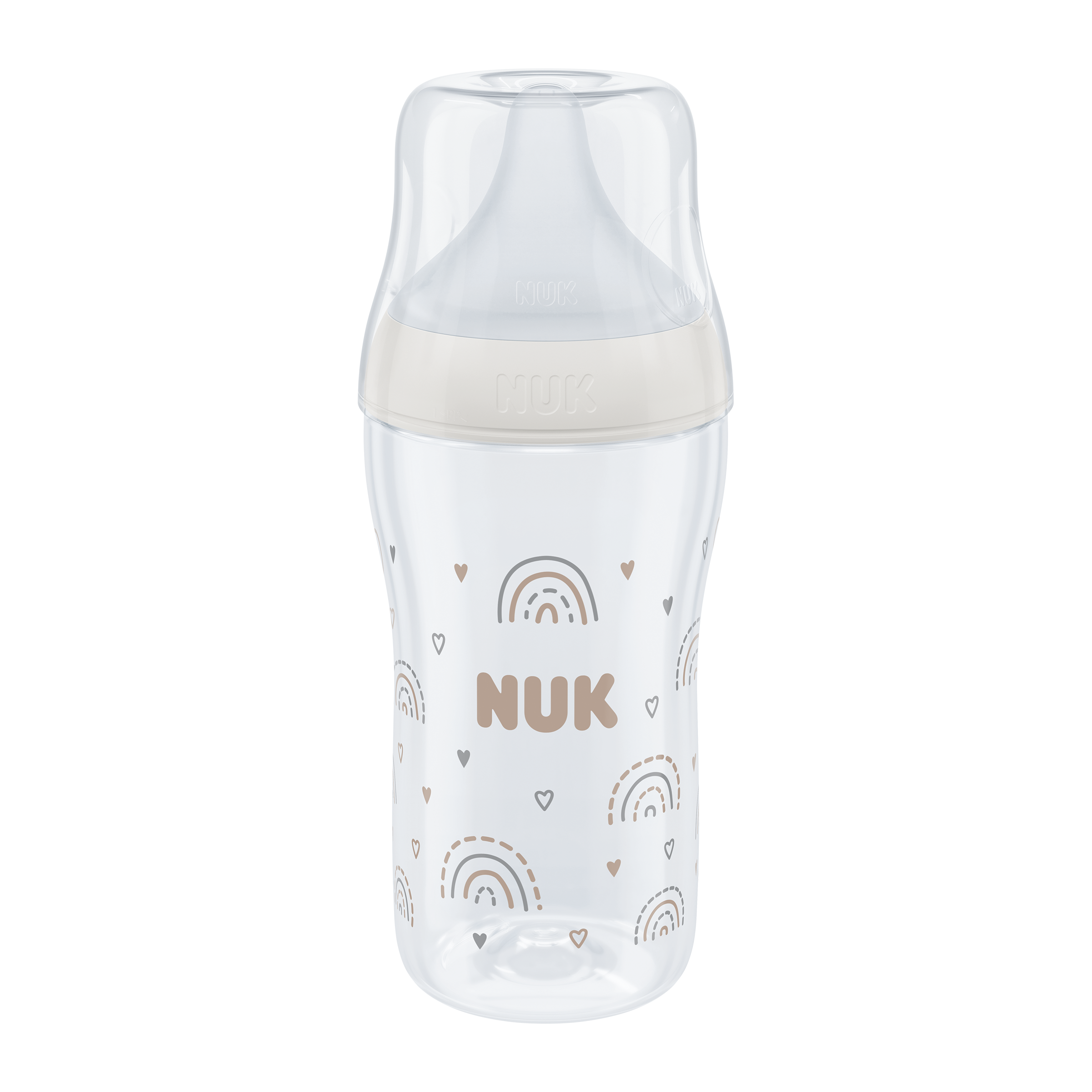 Skleněná kojenecká láhev NUK Perfect Match, s měkkou silikonovou savičkou, 230 ml, od 3 měsíců, neobsahuje BPA, antikolikový systém, s kontrolou teploty.