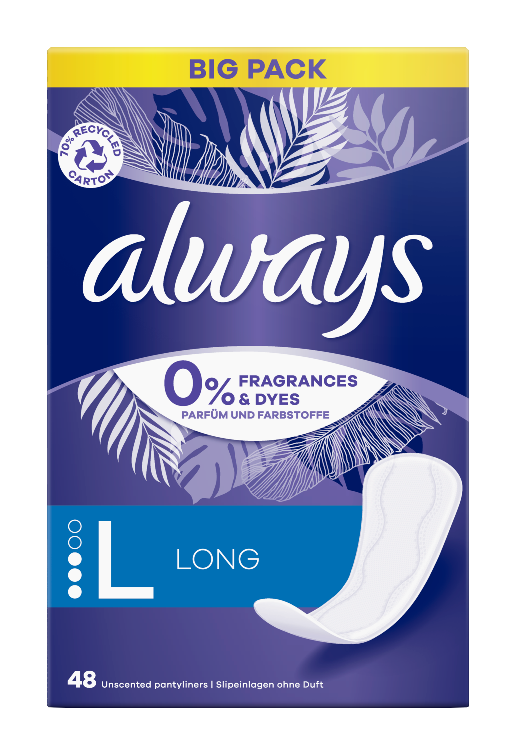 Zůstaňte celý den chráněná s intimkami Always Daily Protect Long. Tyto intimky mají extra délku a šířku pro lepší ochranu a neobsahují vůně ani barviva. Se svou absorbující zónou a postranními ochrannými bariérami jsou vaší každodenní ochranou při vaginálním výtoku, nepravidelné menstruaci a slabém krvácení nebo při lehkém úniku moči. Užijte si svěží pocit čistých kalhotek.