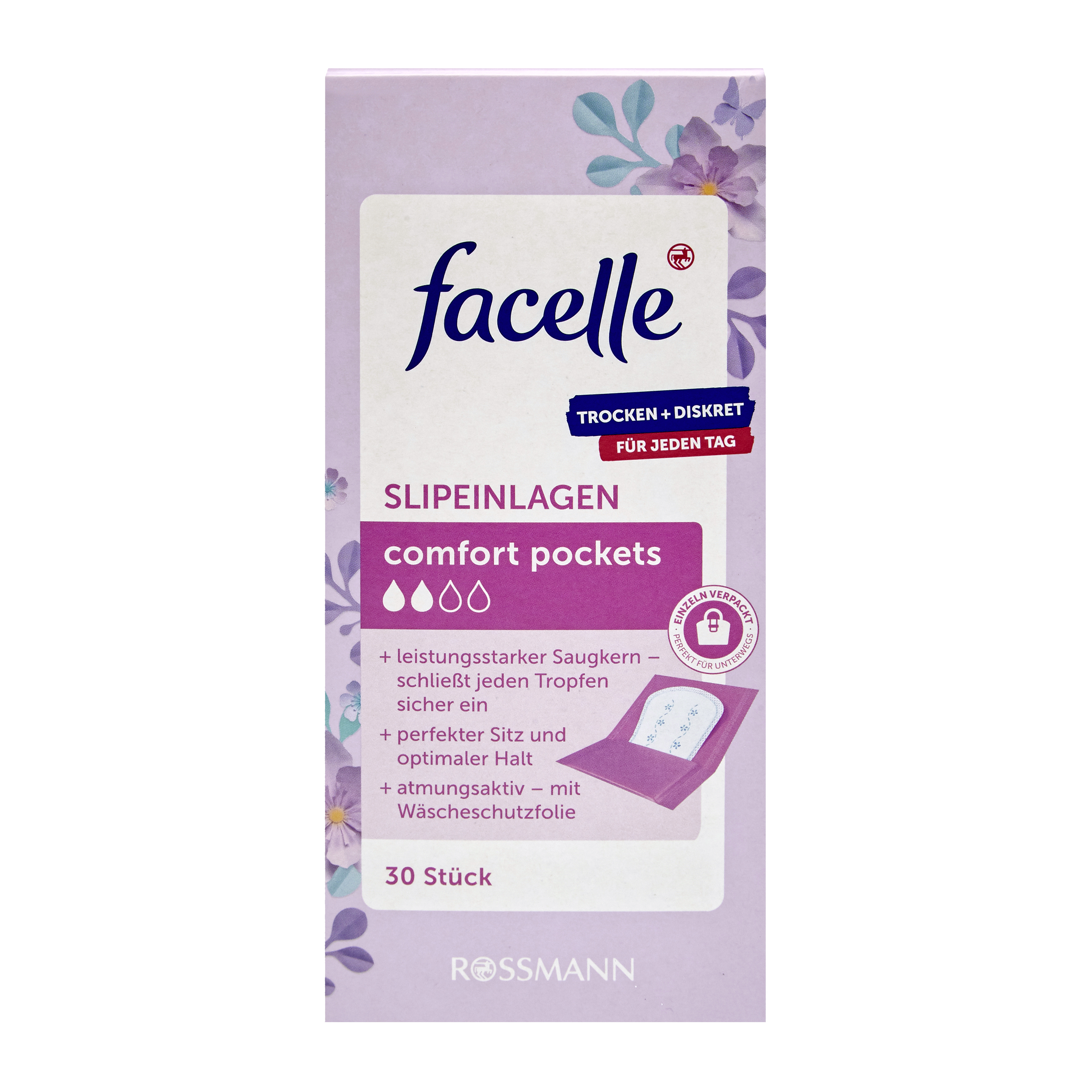 Slipové vložky pro příjemný pocit ochrany během vašich dní. Bezpečné, a přitom diskrétní. Díky svému silnému absorpčnímu jádru uzavřou bezpečně kapalinu a ochrana je navíc podpořena díky přilnavému povrchu, který pevně drží na spodním prádle. Slipové vložky jsou prodyšné a mají zvláště měkký povrch, který je šetrný k pokožce. Každá vložka je prakticky zabalena v obalu, který lze snadno uložit v kabelce nebo na cestách.