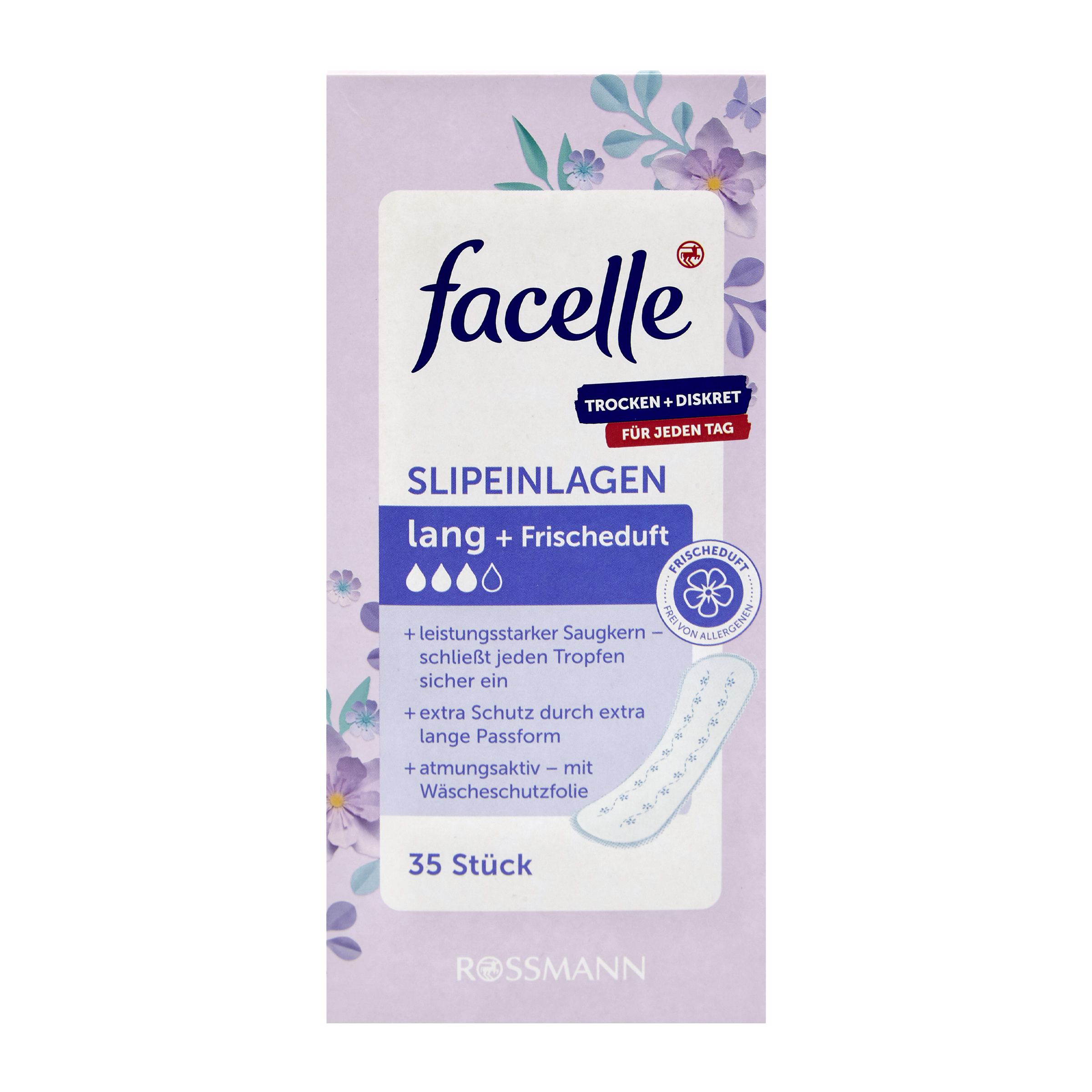 Slipové vložky pro příjemný pocit ochrany během vašich dní. Bezpečné, a přitom diskrétní. Díky svému silnému absorpčnímu jádru uzavřou bezpečně kapalinu a ochrana je navíc podpořena díky jejich dlouhému střihu. Slipové vložky jsou prodyšné a mají zvláště měkký povrch, který je šetrný k pokožce. S jemnou svěží vůní - hypoalergenní.