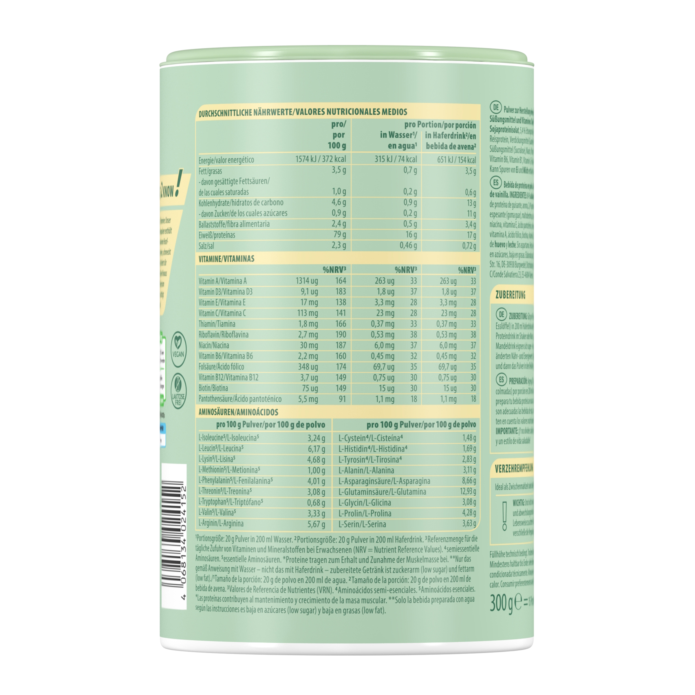 Příprava: Přidejte 20 g prášku (2 vrchovaté polévkové lžíce) na porci do 200 ml ovesného mléka nebo vody a připravte si proteinový nápoj ve šejkru nebo mixéru. Skvělé je také sójové, rýžové nebo mandlové mléko – vezměte prosím v úvahu rozdílné nutriční a energetické hodnoty. Tip: Do nádoby nalijte nejprve tekutinu, poté prášek, aby se lépe rozpustil.