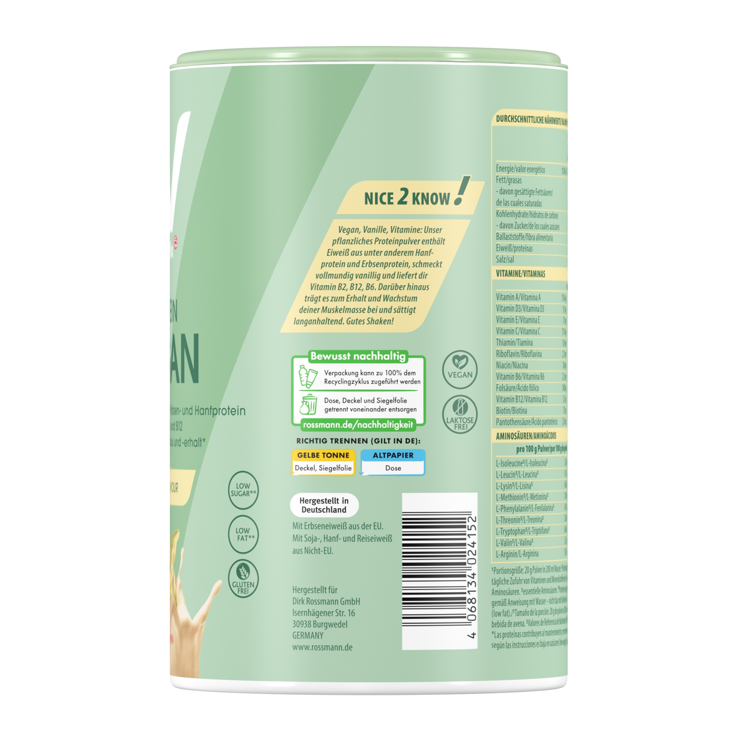 Vegan, vanilka, vitamíny: Náš rostlinný proteinový prášek obsahuje bílkoviny mimo jiné z konopného a hrachového proteinu, má bohatou vanilkovou chuť a dodává vám vitamíny B2, B12 a B6. Přispívá také k udržení a růstu svalové hmoty a poskytuje dlouhotrvající pocit sytosti. Dobrou chuť!