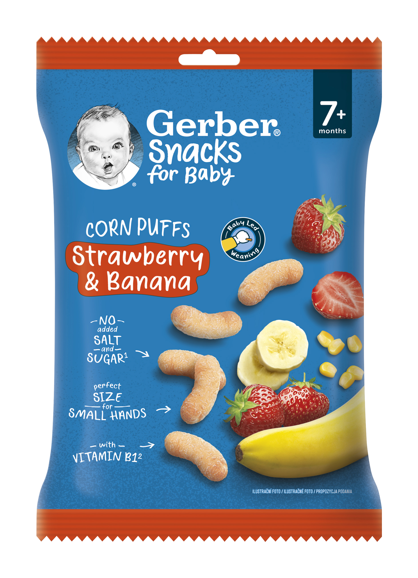 GERBER Snacks kukuřičné křupky jahoda a banán 28 g. Extrudovaný výrobek. Baleno v ochranné atmosféře. Kukuřičné křupky jahodovo-banánové skvěle padnoucí do malých ruček. Určeno pro děti od ukončeného 7. měsíce. GERBER Snacks kukuřičné křupky jahoda a banán představují chutnou a praktickou svačinku, která je určena pro děti od ukončeného 7. měsíce. Křupky jsou obohaceny o vitamín B1**, který přispívá k získávání a využívání energie v důležitém období děťátka. Křupky jsou tvarem i strukturou speciálně přizpůsobené potřebám malého dítěte pro radost ze samostatnosti při jídle. Díky své křehké textuře se snadno rozpustí v dětské pusince a vy se tak nemusíte bát o bezpečí svého malého mlsouna. Křupky poslouží jako praktická svačinka nejen na doma, ale i na cesty. Křehké křupky vedou k rozvoji samostatnosti v období, kdy děťátko začíná lézt, poznává nové tvary a dokáže již jídlo uchopit do svých rukou. Křupky totiž svým tvarem a velikostí skvěle padnou do malých ruček a napomáhají tak rozvoji dětské motoriky.