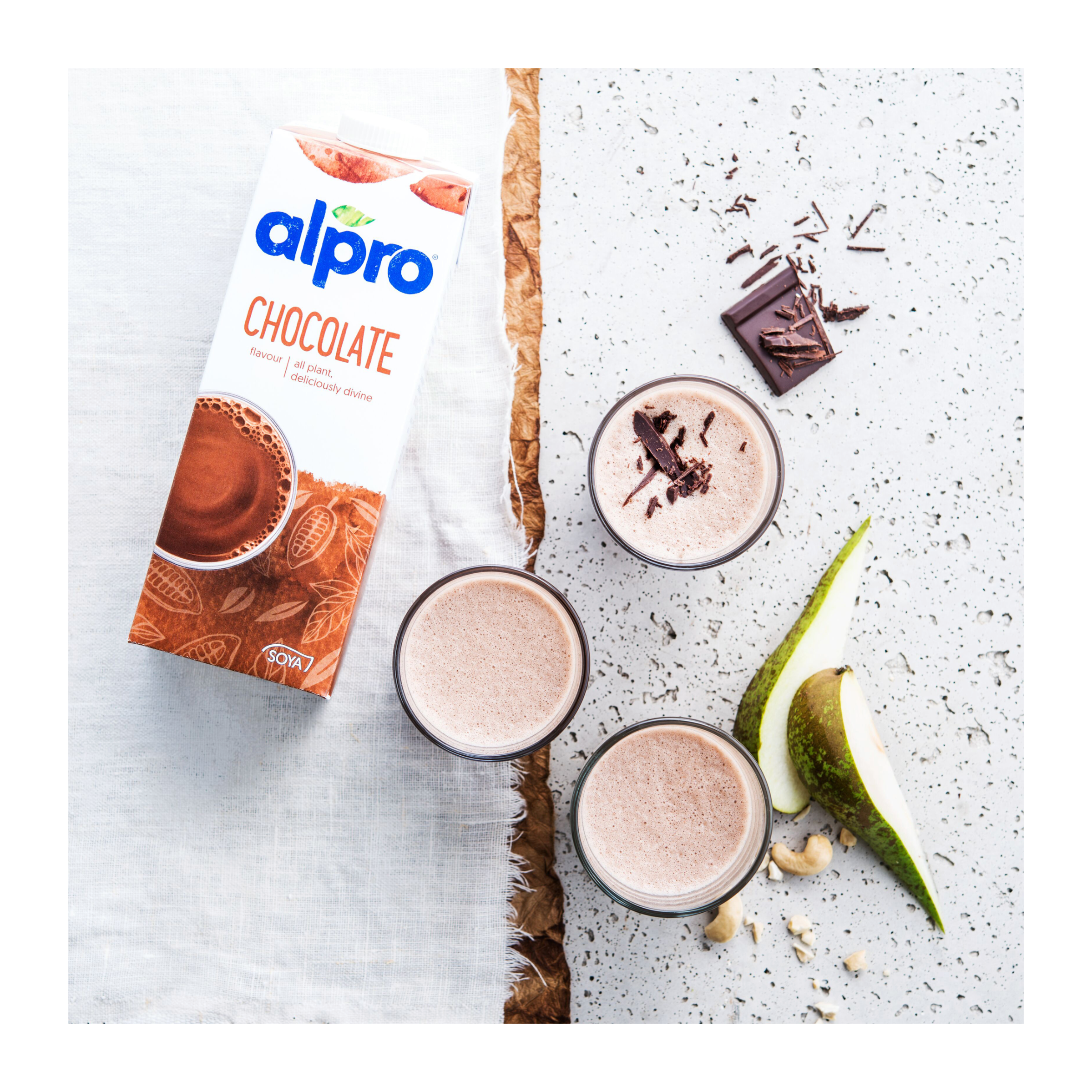 O našem čokoládovém sójovém nápoji můžeme říct tři slova: pojď do něj! Seznam se s Alpro sójovým nápojem s čokoládovou příchutí. Rozhodnutí přejít na rostlinnou alternativu mléka oceňujeme a určitě máš spoustu důvodů se díky tomu cítit prostě skvěle. Je to dobré pro tebe i pro planetu. A teď si pojď dopřát vychlazenou sklenici plnou bohaté čokoládové chuti. A nebo si vylepšíš své ranní cereálie? Proč ne?