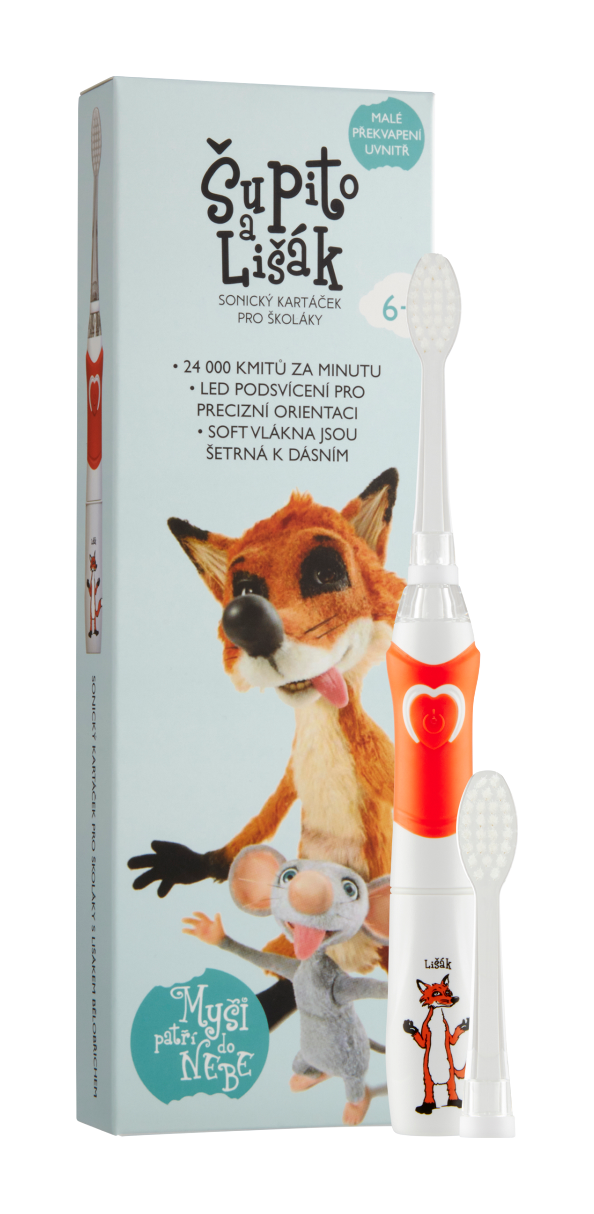 Sonický kartáček má zaoblenou hlavici vhodnou do dětských úst. Měkká vlákna jsou šetrná k citlivým dásním a jemně čistí zoubky. Sonická technologie je bezpečná. Jemná a šetrná vlákna kartáčku kmitají a tím doplňují standardně prováděné čistící pohyby. Kartáček je vybaven 2minutovým časovačem, který dodržuje doporučenou dobu čištění s tím, že přednastavené intervaly po 30 sekundách pomohou k důkladnému čištění všech kvadrantů chrupu – horní a dolní vpravo, horní a dolní vlevo. Podsvícená hlavice usnadňuje orientaci v ústech, lehká a ergonomická rukojeť se dobře ovládá rodičům i dětem. Výrobek není hračka. Uchovávejte mimo dosah dětí. Dětem by nemělo být dovoleno si s přístrojem hrát, čistit jej nebo opravovat. Kartáček může být používán dětmi a osobami se sníženými fyzickými, smyslovými nebo duševními schopnostmi pouze pod dohledem zkušené a zodpovědné osoby, která zaručí jejich bezpečnost. Neponořujte kartáček na příliš dlouhou dobu do vody. Nesnažte se u výrobku měnit jiné části než baterii a čisticí hlavici. Nevystavujte výrobek vysokým teplotám ani přímému slunečnímu světlu. Dbejte na to, aby baterie byla vložena správnou polaritou. Vkládejte pouze kvalitní baterie AAA. Vybitá baterie by měla být ekologicky zlikvidována.