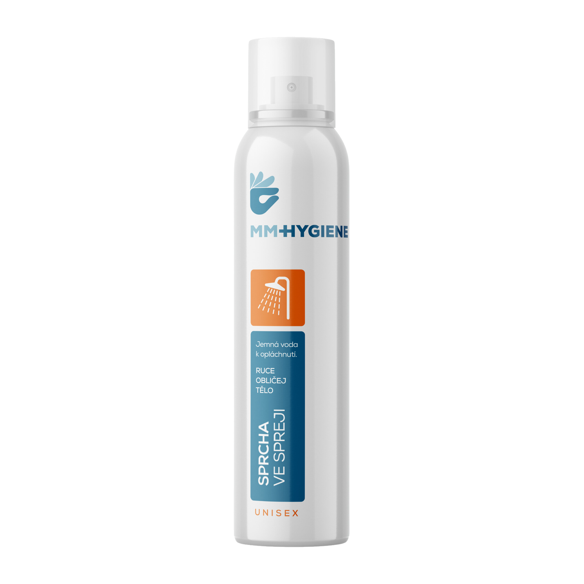 Sprcha ve spreji MM Hygiene, vhodná pro okamžité umytí rukou, těla a obličeje.