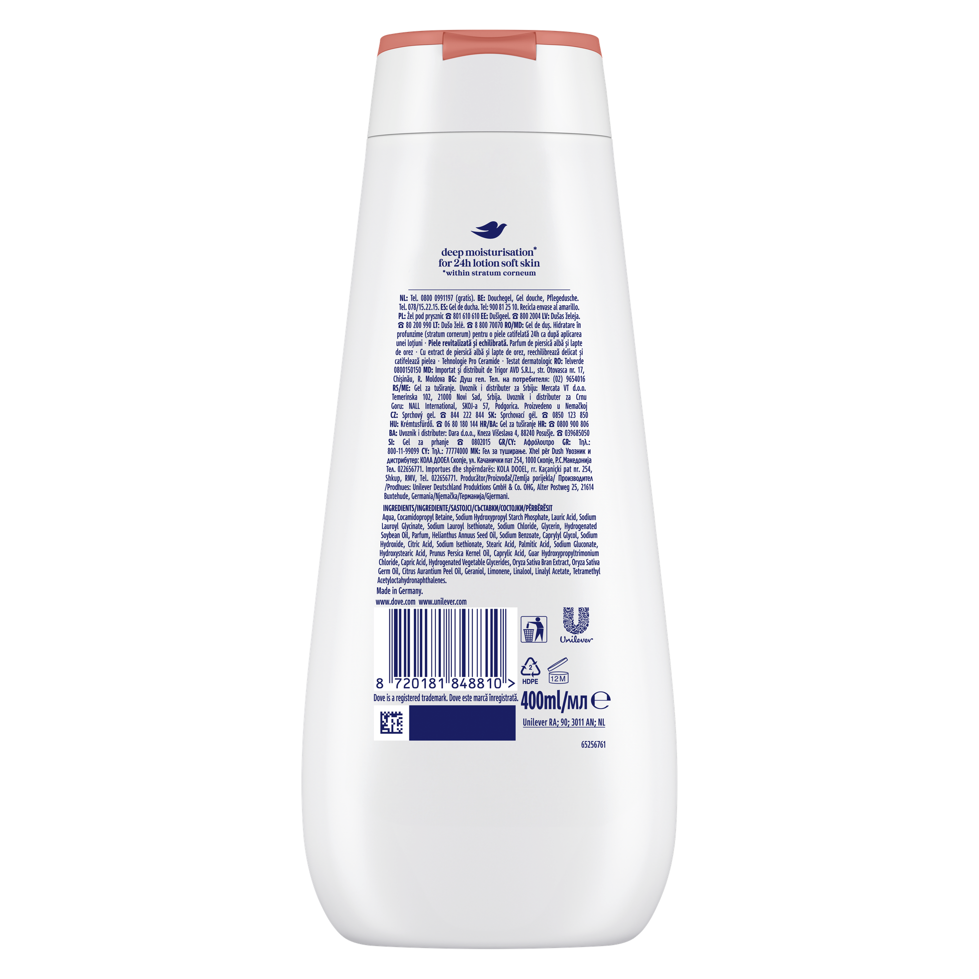 Extra výživná receptura s patentovanou technologií Pro-Ceramide pomáhá posilovat a obnovovat kožní bariéru a zabraňuje ztrátě hydratace. Obsahuje také 12-HSA, složku známou pro podporu tvorby ceramidů v pokožce. Výsledkem je jemná, vyvážená a zdravě vypadající pokožka po celý den. Sprchový gel zaujme jemnou vůní bílé broskve a rýžového mléka, která promění každodenní sprchu v příjemný pečující rituál.