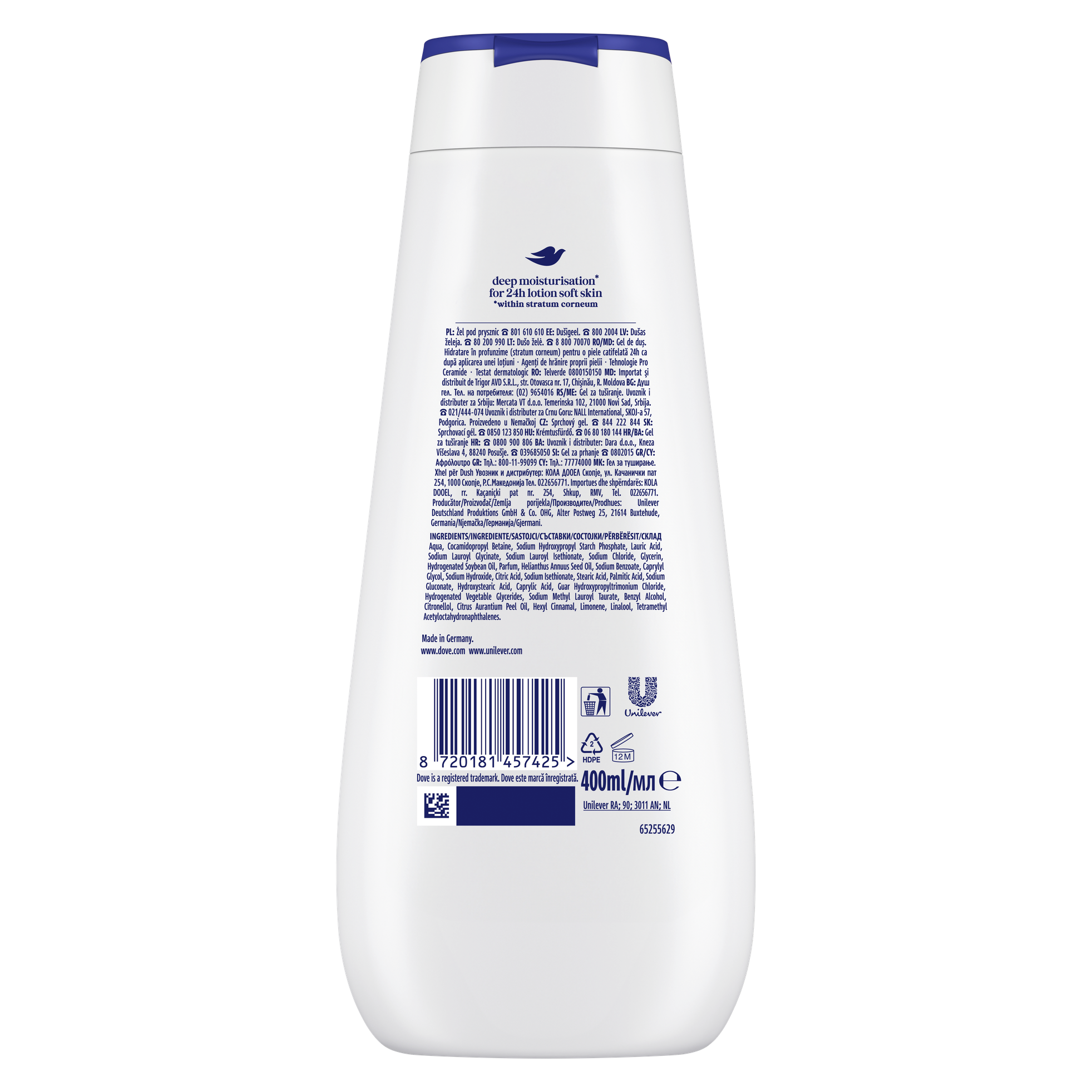 Dove Advanced Care jsou revoluční sprchové gely pro jemnou a hydratovanou pokožku jako po použití tělového mléka na celých 24 hodin. Každá pokožka je jiná - proto se nedostatečná hydratace projevuje u každého jinak. Od mírné, občasně suché pokožky způsobené výkyvy počasí, až po závažnější suchost s podrážděnými místy. Pečujte o hydrataci suché pokožky už ve sprše s novými krémovými sprchovými gely Dove. Nová řada sprchových gelů Dove Advanced Care má extra výživné složení pro okamžitě hydratovanou pokožku. Je obohacena o novou patentovanou technologií 24h Renewing MicroMoisture, která rozkládá olejové kapky na miliony mikrokapek pro lepší výživu pokožky. Výsledkem je vyživená a zdravě vypadající pokožka po celý den. Získejte pocit hydratované pokožky jako po použití tělového mléka. Díky kombinaci vyživujícího složení s řadou nádherných vůní, sprchové gely Dove Advanced Care změní váš přístup ke každodenní sprše. Klasická jemná pudrová vůně. Extra výživné složení vhodné především pro velmi suchou pokožku.