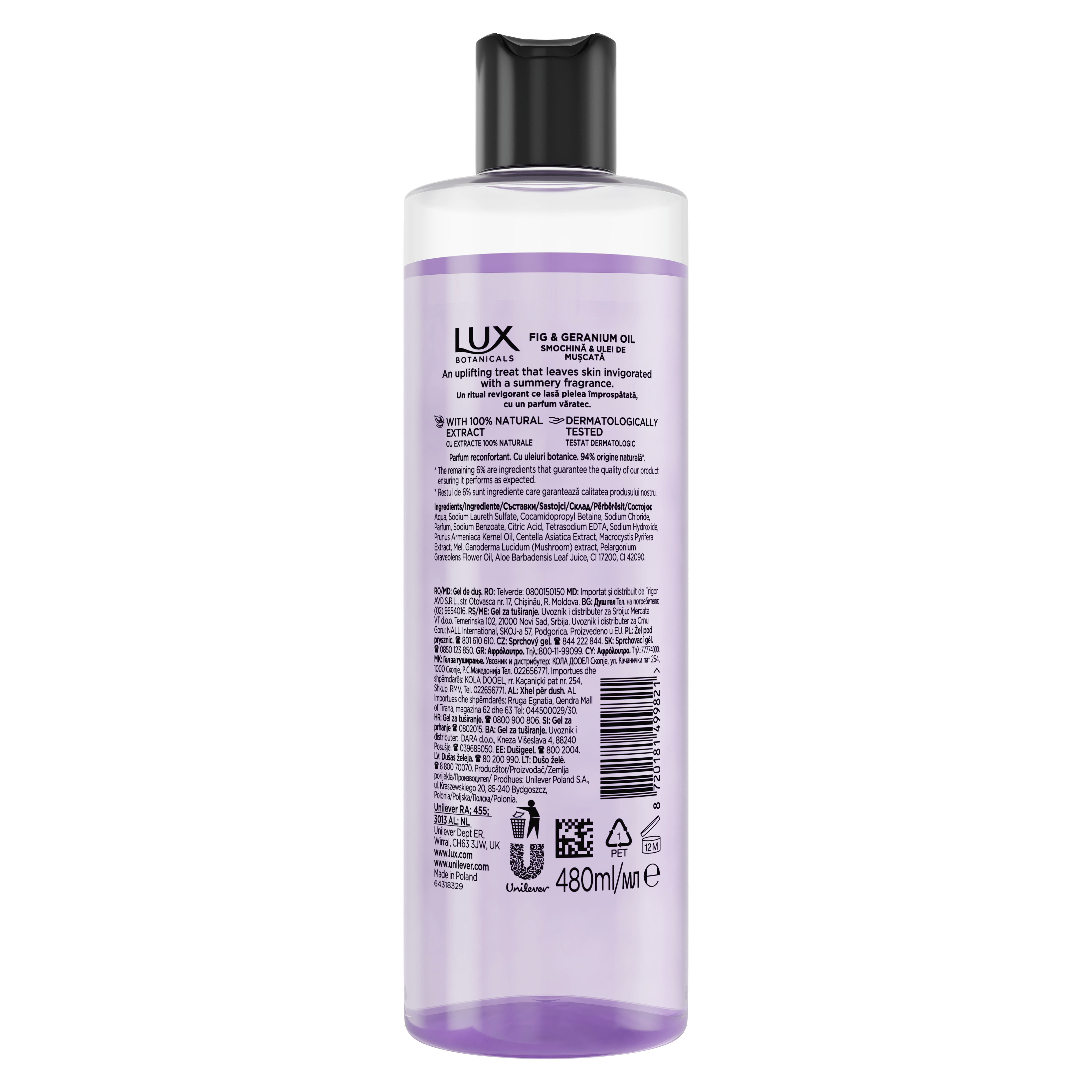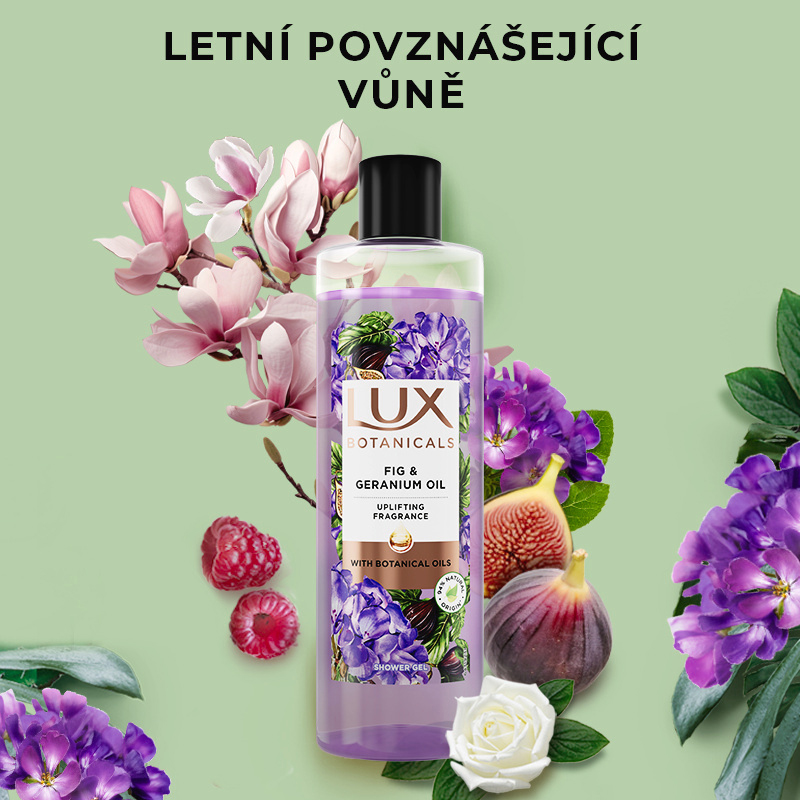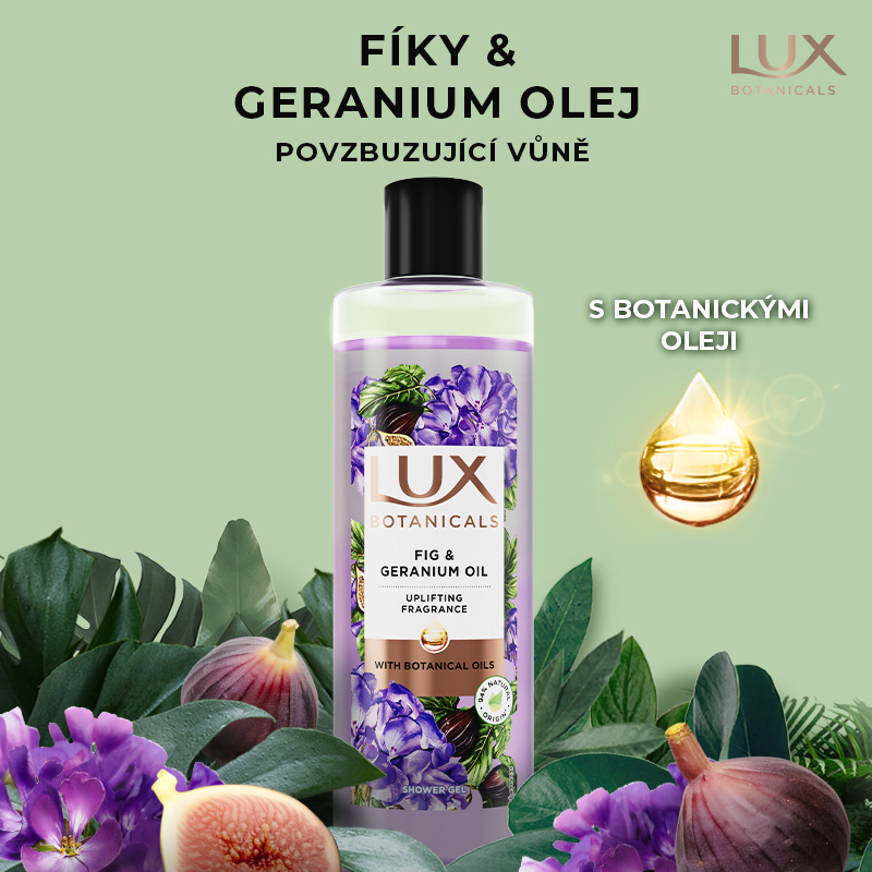 Lux sprchový gel Fig - povzbuzující péče, která zanechá pokožku provoněnou kořeněnou letní vůní. Sprchový gel Fig & Geranium Oil je smyslný sprchový gel pro každodenní péči. Kombinace nasládlé exotické vůně fíků a kořeněné květinové vůně geranium oleje vás přenesou do horkého léta ve Středomoří. Představte si ranní procházku v luxusním sadu, kde rostou šťavnaté fíky a maliny. Geranium olej je zároveň jeden z nejlepších způsobů, jak uvolnit nervové napětí. Unikátní receptura sprchového gelu vyživí a provoní pokožku, takže je provoněná, hladká a v harmonické rovnováze zevnitř i na povrchu. Po otevření lahve se nejdříve rozline sladká vůně fíků, svěstek a malin, pozvolna se uvolní květinové tóny magnólie, frézie a růže a základ vůně tvoří kokos a jojoba.