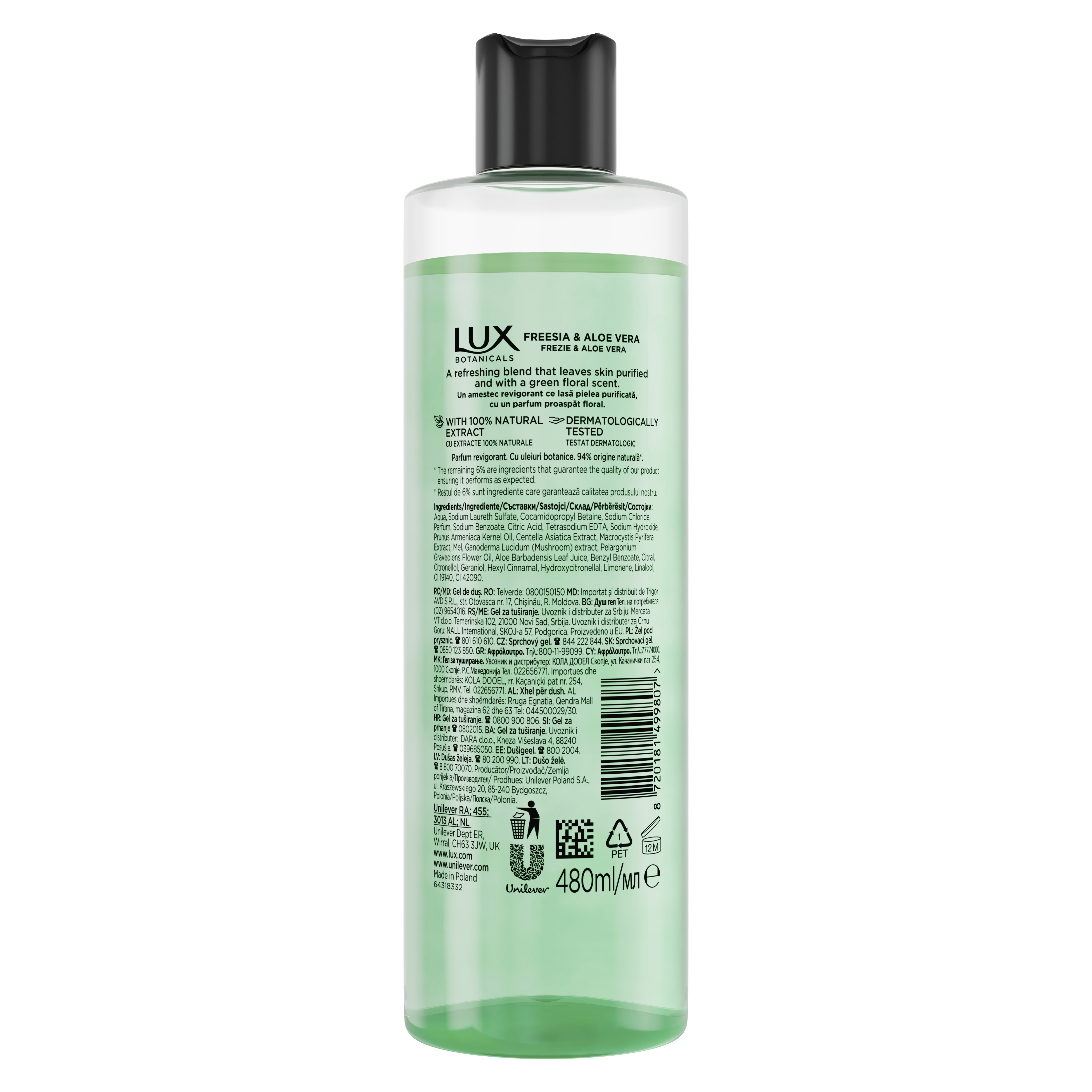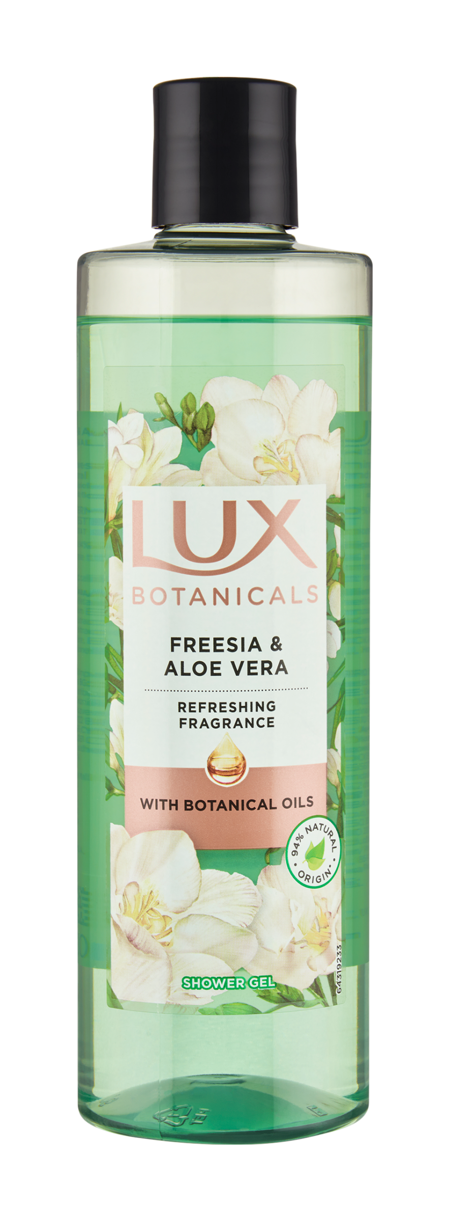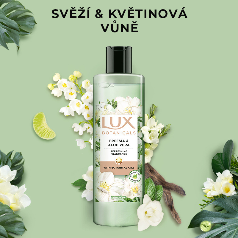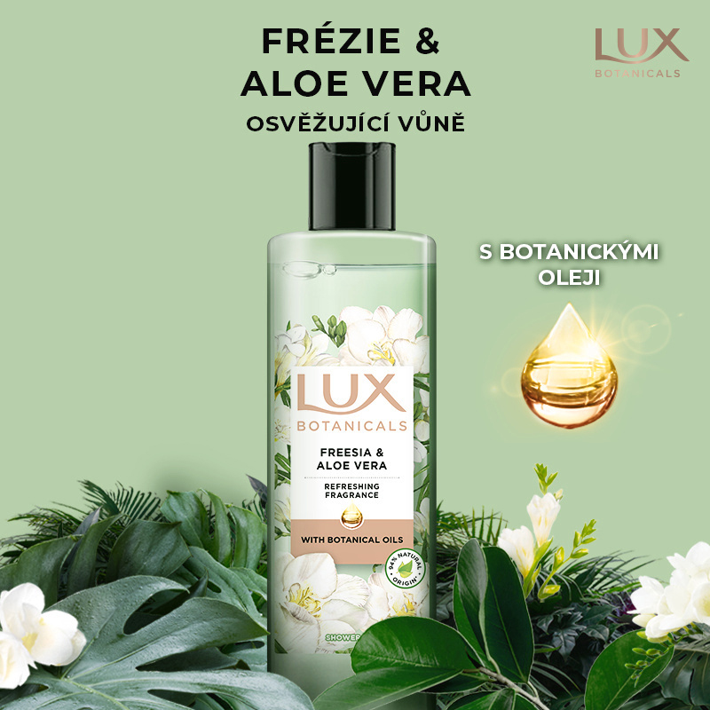 LUX sprchový gel Freesia - osvěžující péče, která zanechá pokožku svěží a čistou s jemnou květinovou vůní. Lux Botanicals Freesia & Aloe Vera je osvěžující sprchový gel pro každodenní péči s nádhernou vůní frézie a aloe vera. Unikátní receptura s výtažky z aloe vera má zklidňující účinek na pokožku, díky čemuž je pokožka svěží, hladká a provoněná. Sprchový gel má krásnou, exotickou a jemnou vůni, díky které je sprcha skutečným relaxačním zážitkem. Ponořte se do klidné ranní zahrady, kde je vzduch nabitý osvěžující vůní exotických frézií. Po otevření lahve se nejdříve rozline vůně aromatické kolínské a citrusu, pozvolna se uvolní květinové tóny růže a základ vůně tvoří dřevité a ambrové tóny.