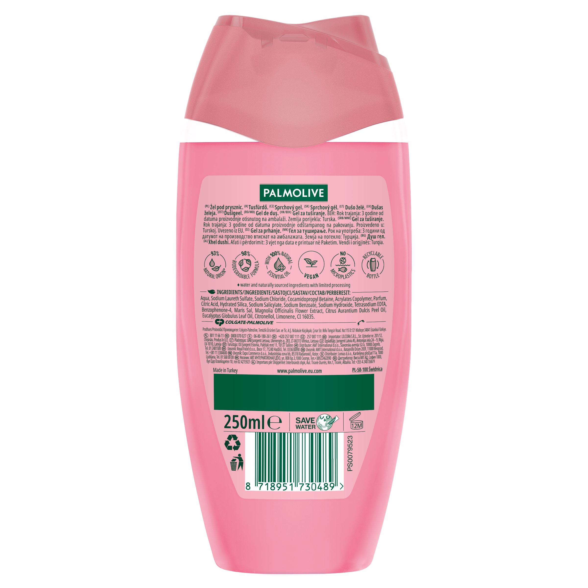 Aqua, Sodium Laureth Sulfate, Sodium Chloride, Cocamidopropyl Betaine, Acrylates Copolymer, Parfum, Citric Acid, Hydrated Silica, Sodium Salicylate, Sodium Benzoate, Sodium Hydroxide, Tetrasodium EDTA, Benzophenone-4, Maris Sal, Magnolia Officinalis Flower Extract, Citrus Aurantium Dulcis Peel Oil, Eucalyptus Globulus Leaf Oil, Citronellol, Limonene, CI 16035.