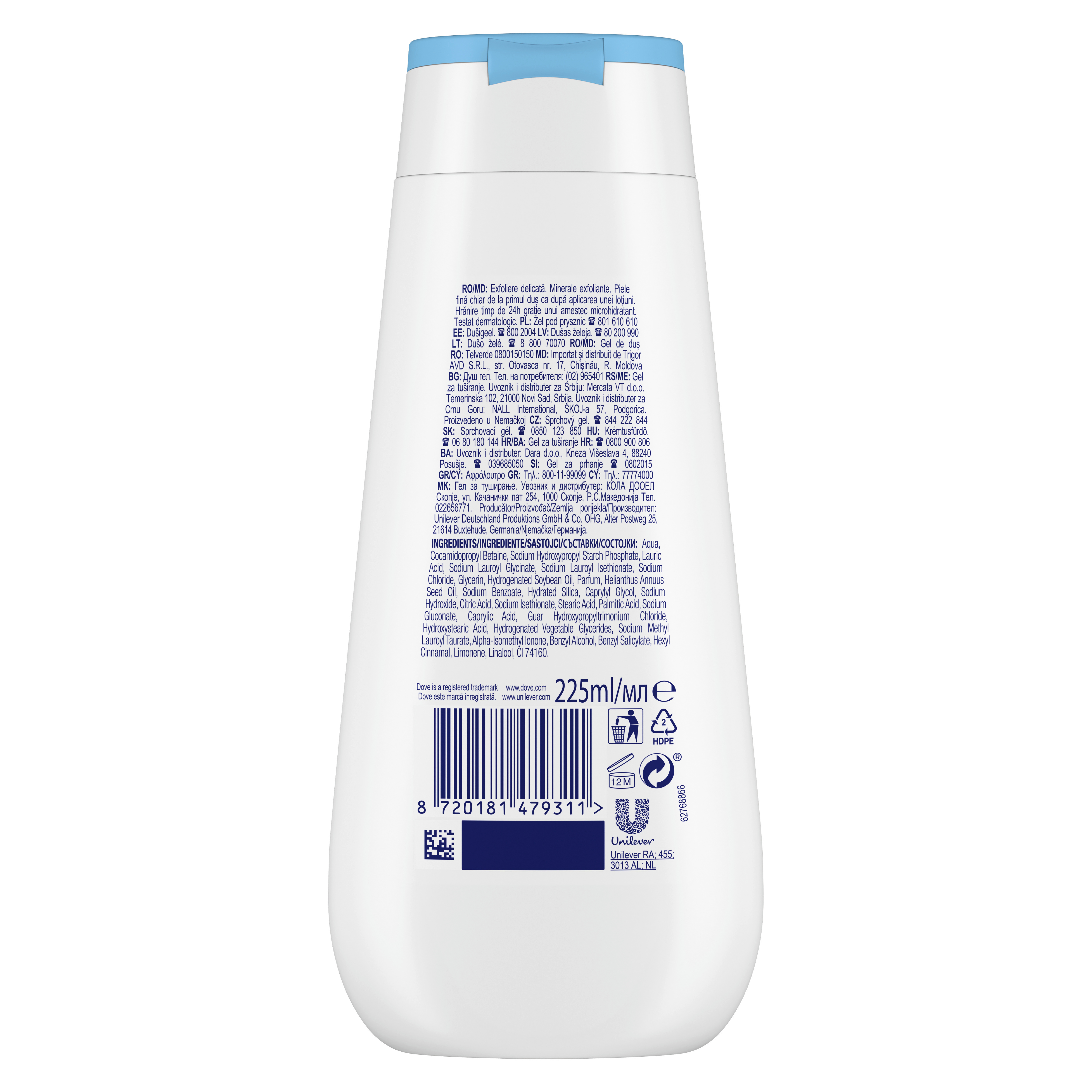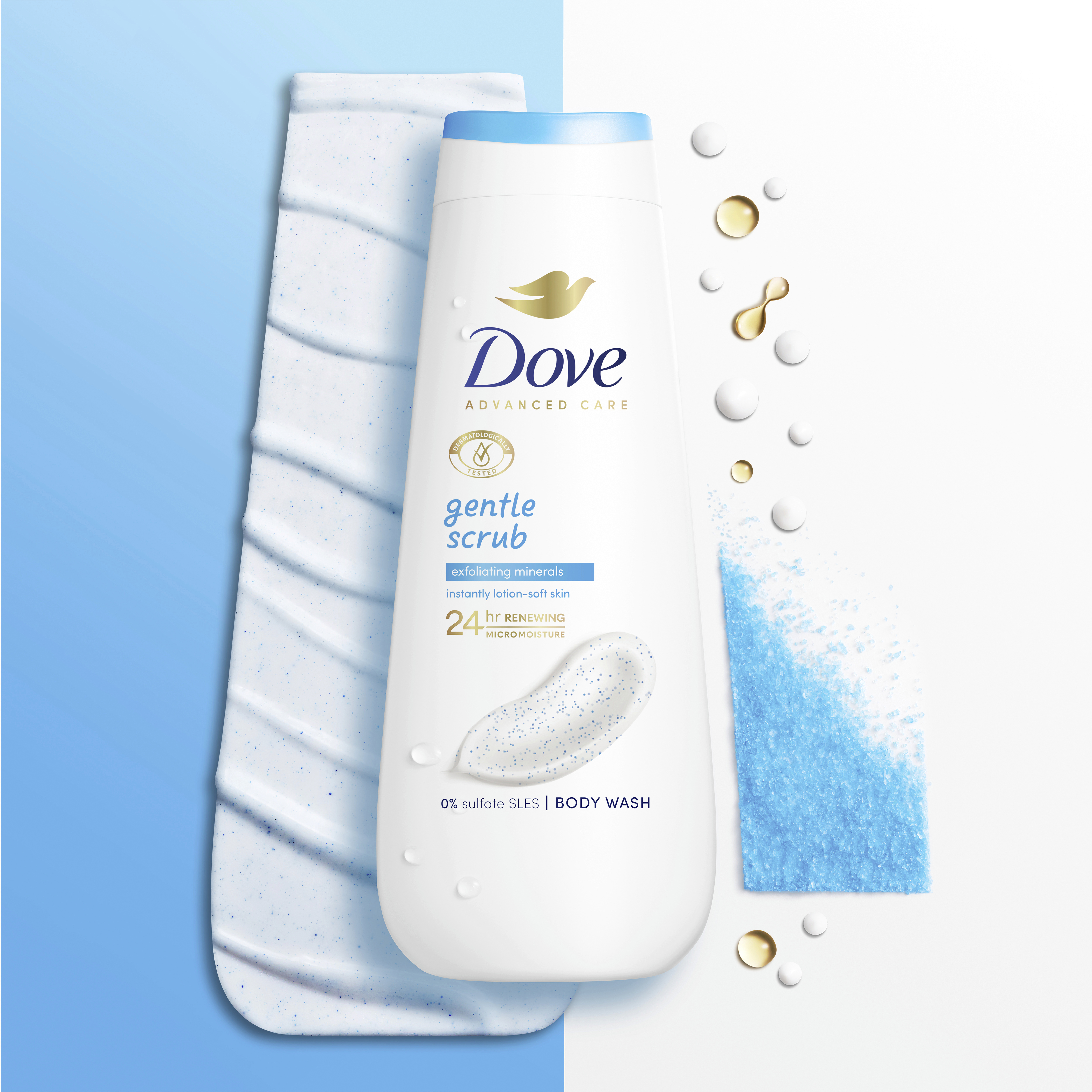 Dove Advanced Care jsou revoluční sprchové gely pro jemnou a hydratovanou pokožku jako po použití tělového mléka na celých 24 hodin. Každá pokožka je jiná - proto se nedostatečná hydratace projevuje u každého jinak. Od mírné, občasně suché pokožky způsobené výkyvy počasí, až po závažnější suchost s podrážděnými místy. Pečujte o hydrataci suché pokožky už ve sprše s novými krémovými sprchovými gely Dove. Nová řada sprchových gelů Dove Advanced Care má extra výživné složení pro okamžitě hydratovanou pokožku. Je obohacena o novou patentovanou technologií 24h Renewing MicroMoisture, která rozkládá olejové kapky na miliony mikrokapek pro lepší výživu pokožky. Výsledkem je vyživená a zdravě vypadající pokožka po celý den. Získejte pocit hydratované pokožky jako po použití tělového mléka. Díky kombinaci vyživujícího složení s řadou nádherných vůní, sprchové gely Dove Advanced Care změní váš přístup ke každodenní sprše. Dove Advanced Care Gentle Scrub sprchový gel jemně odstraňuje odumřelé buňky pro ještě hebčí pokožku.