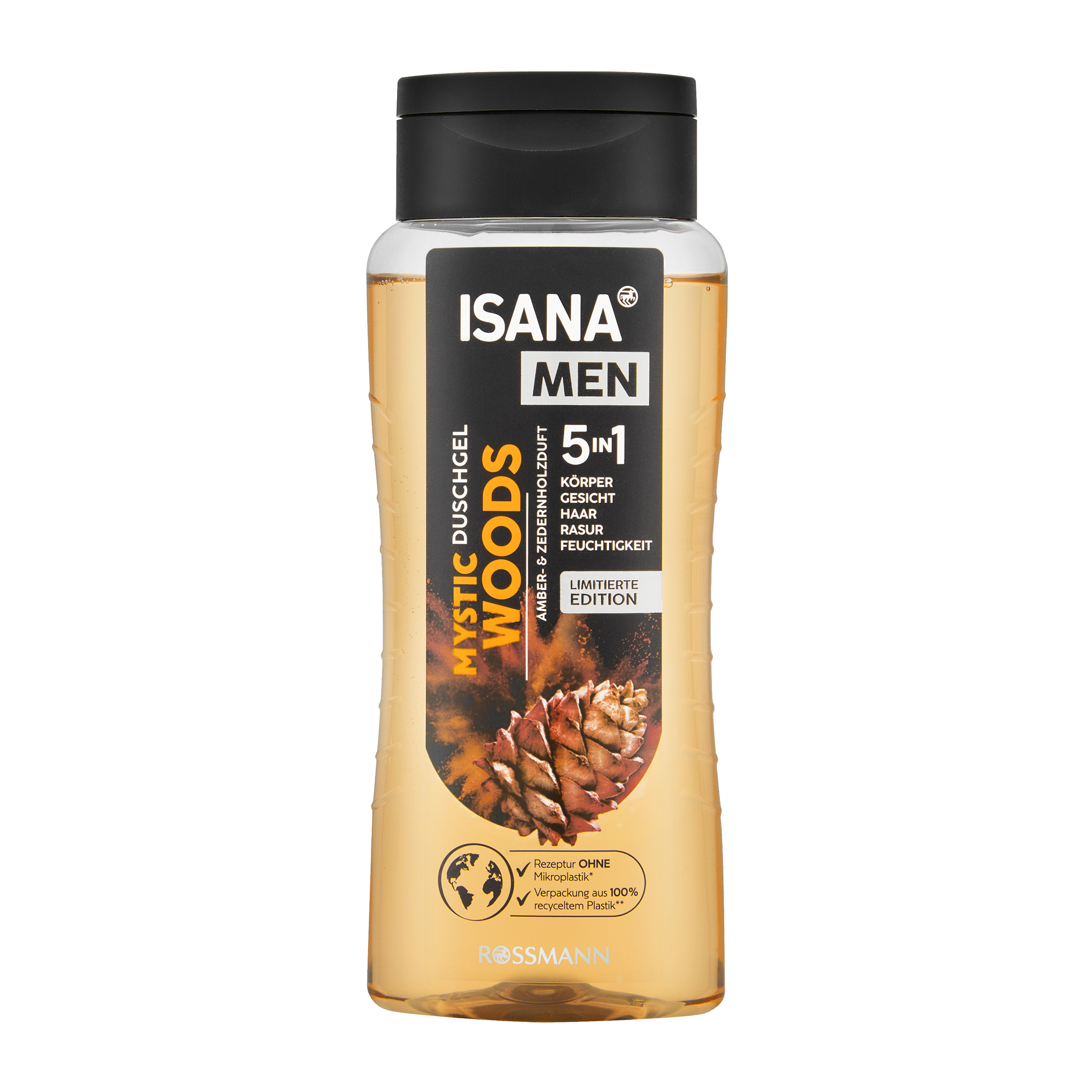 Sprchový gel ISANA Men 5v1 Mystic Woods: Kombinace vůní smyslné ambry, hřejivého cedrového dřeva a aromatického bergamotu pro vzrušující zážitek ze sprchování.