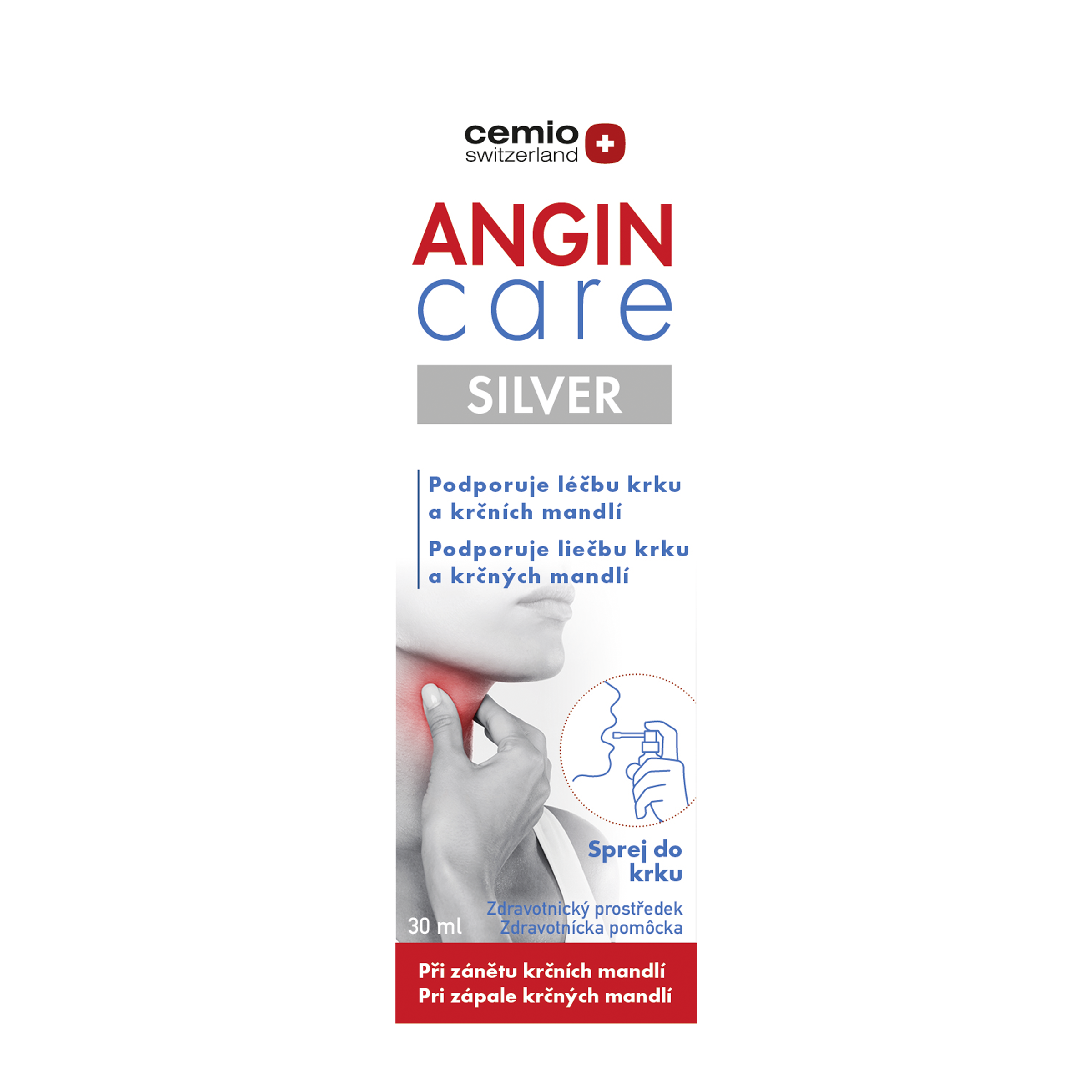 Zdravotnický prostředek Cemio ANGIN care, sprej do krku, lze podpůrně použít při zánětu krčních mandlí, po odstranění krčních mandlí, při zánětu sliznice hltanu, při zánětu sliznice dutiny ústní.