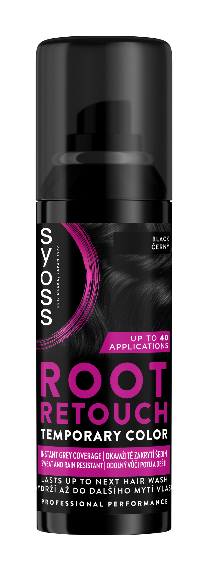Syoss Root Retouch černý až na 40 použití! Okamžitě zakryjte odrosty během několika sekund se sprejem Syoss Root Retouch! Tento sprej na úpravu odrostů je rychlý a snadný na použití díky okamžitému schnutí, které zajistí rovnoměrný barevný výsledek, jenž dokonale splyne s délkami vlasů. Černý sprej na odrosty Syoss má přesný aplikátor, který vám pomůže zakrýt odrosty přesně tam, kde je to potřeba.