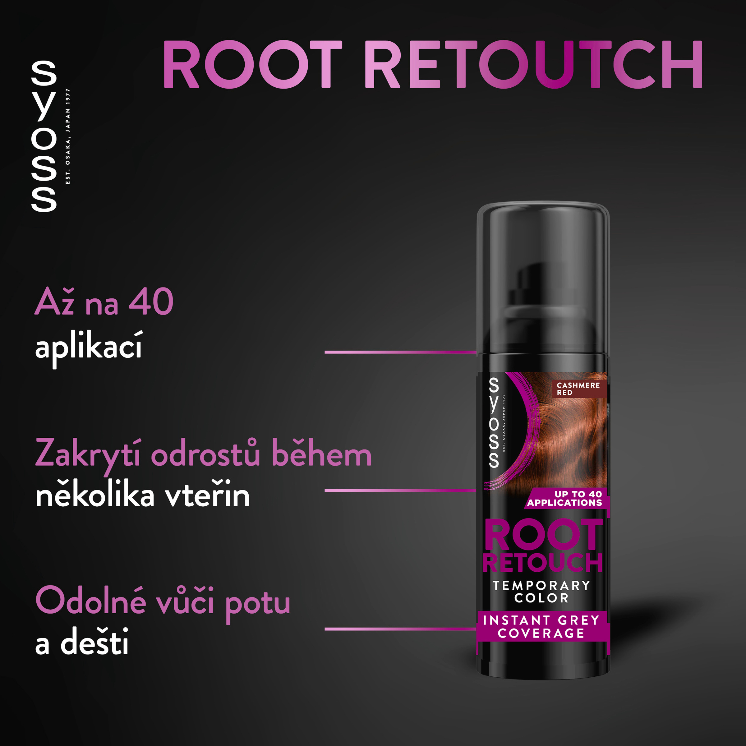Syoss Root Retouch kašmírově červený až na 40 použití! Okamžitě zakryjte odrosty během několika sekund se sprejem Syoss Root Retouch! Tento sprej na úpravu odrostů je rychlý a snadný na použití díky okamžitému schnutí, které zajistí rovnoměrný barevný výsledek, jenž dokonale splyne s délkami vlasů. Kašmírově červený sprej na odrosty Syoss má přesný aplikátor, který vám pomůže zakrýt odrosty přesně tam, kde je to potřeba. Okamžité zakrytí odrostů během pár sekund.