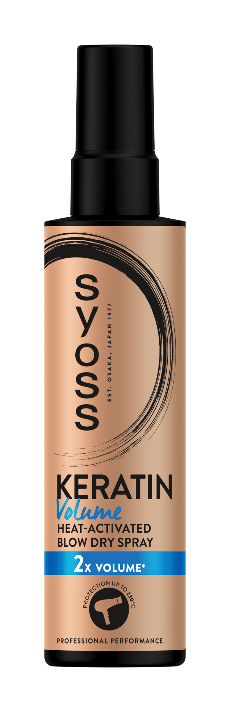 Syoss Keratin & Volume blow dry sprej pro tepelnou ochranu až do 230°C. Až 2x větší objem ve srovnání s neošetřenými vlasy. Efekt proti splihnutí účesu, pro sílu a strukturu vlasů přímo od kořínků.