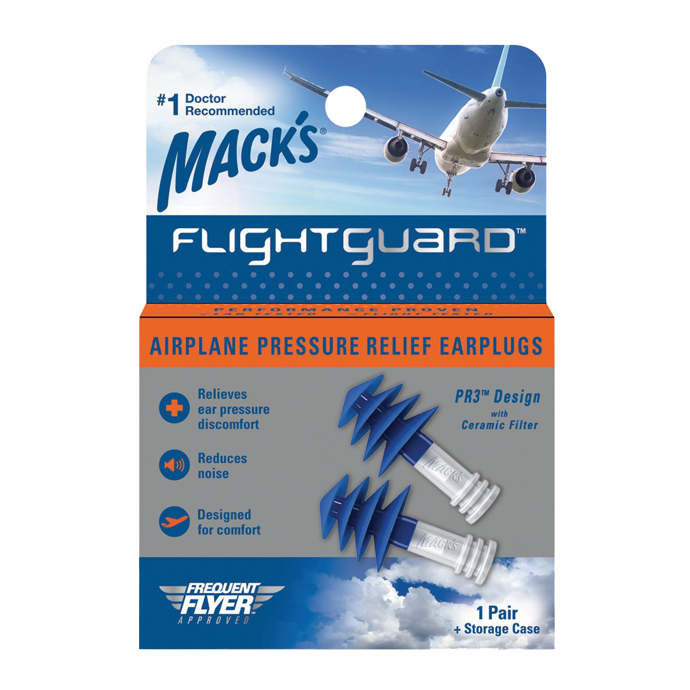 Špunty do uší do letadla Flightguard od Mack's pomáhají účinně vyrovnávat tlak v uších během vzletu i přistání a zároveň snižují hluk pro pohodlnější a klidnější cestování. Jedinečná technologie PR3™ a keramický filtr byly laboratorně testovány a bylo ověřeno, že snižují nepohodlí způsobené změnou tlaku, což ocení zejména cestující s citlivým sluchem nebo potížemi při létání. Pevná stopka zajišťuje snadnou manipulaci a díky měkkým přírubám je nošení špuntů komfortní po celou dobu letu. Balení obsahuje praktické cestovní pouzdro, které usnadní hygienické uložení špuntů během přesunů.