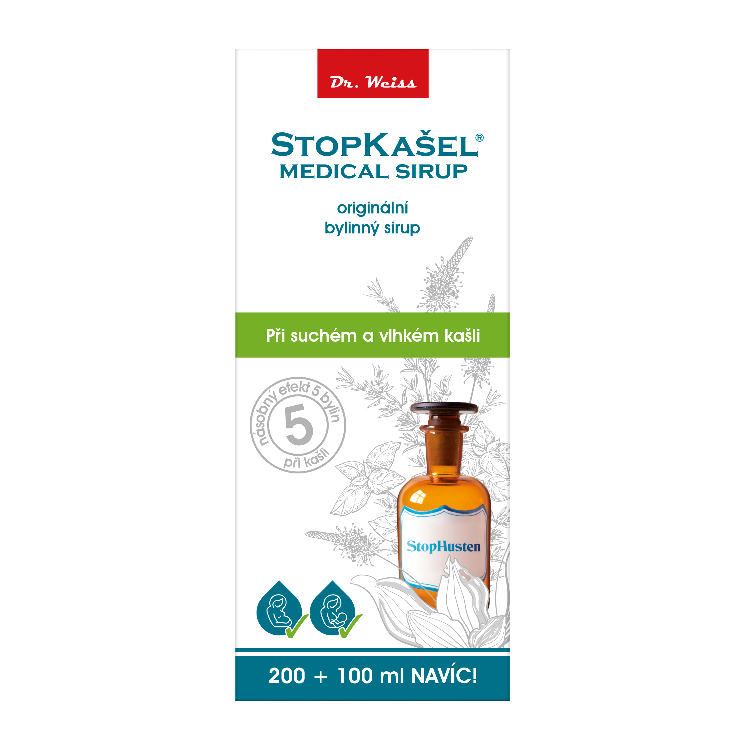 STOPKAŠEL Medical sirup Dr. Weiss je zdravotnický prostředek, který obsahuje unikátní směs 5 bylinných extraktů (jitrocel, boswellie, mateřídouška, bazalka, eukalyptus), které pomáhají při projevech suchého a vlhkého kašle.