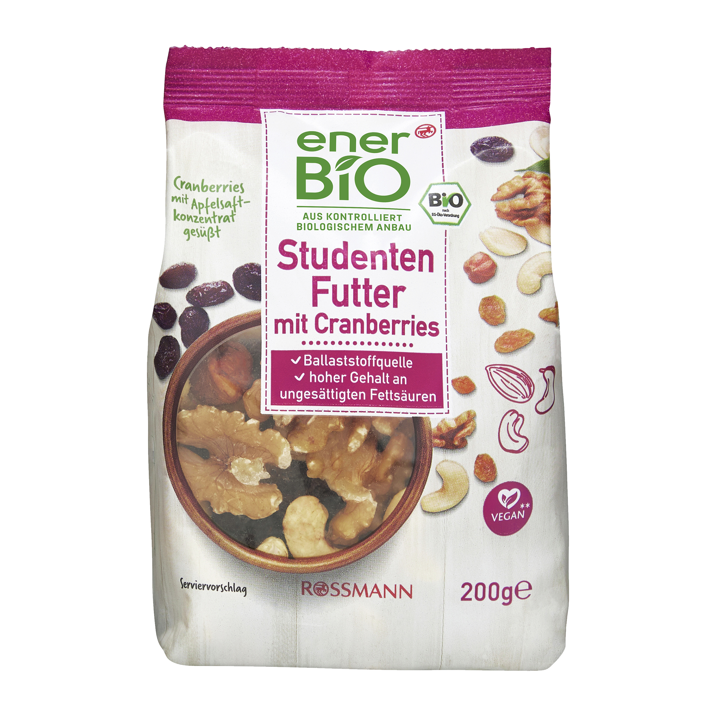 40 % sultánky (sušené), kešu, jádra vlašských ořechů, mandle (blanšírované), jádra lískových ořechů, 10 % sušené brusinky (brusinky, koncentrát jablečné šťávy, slunečnicový olej).