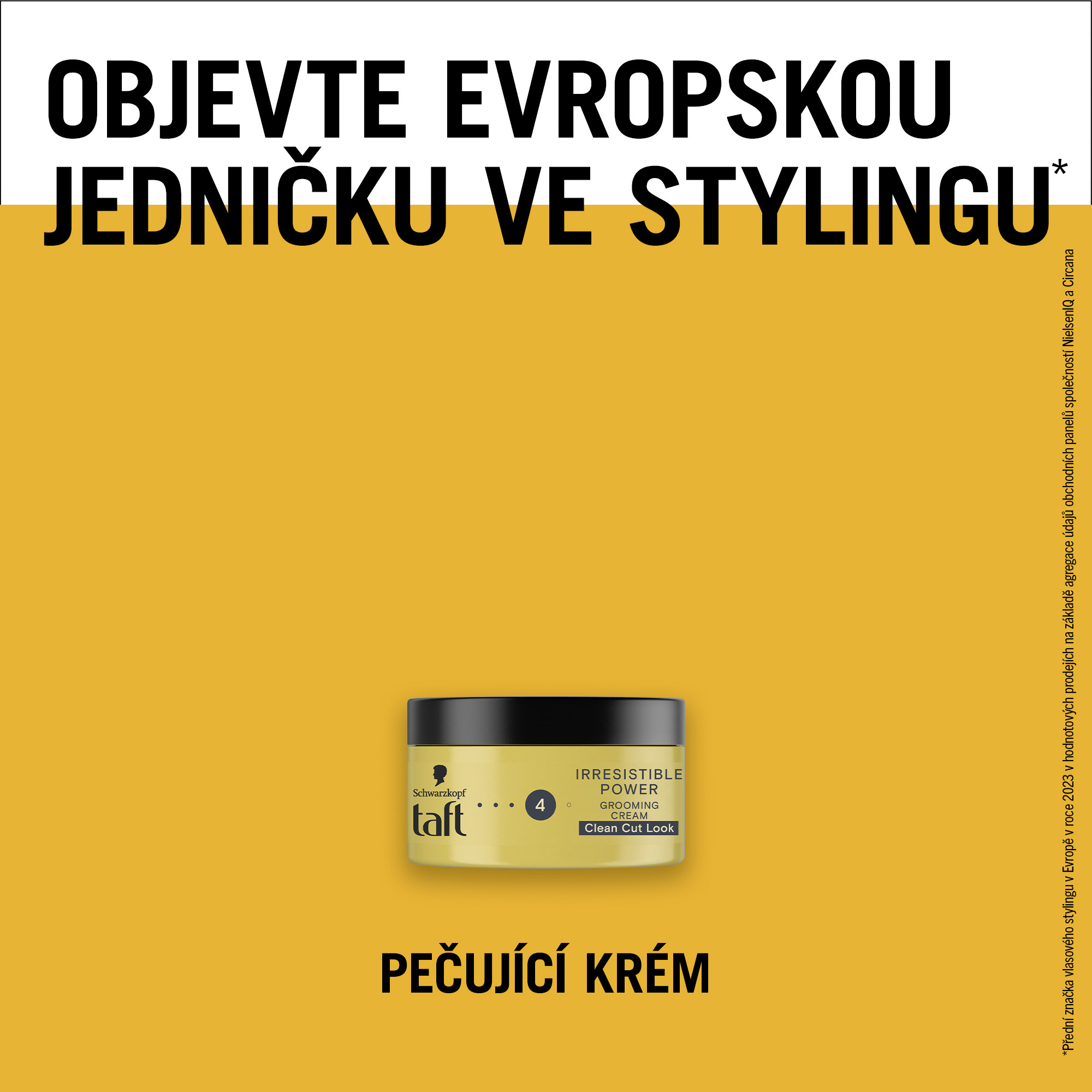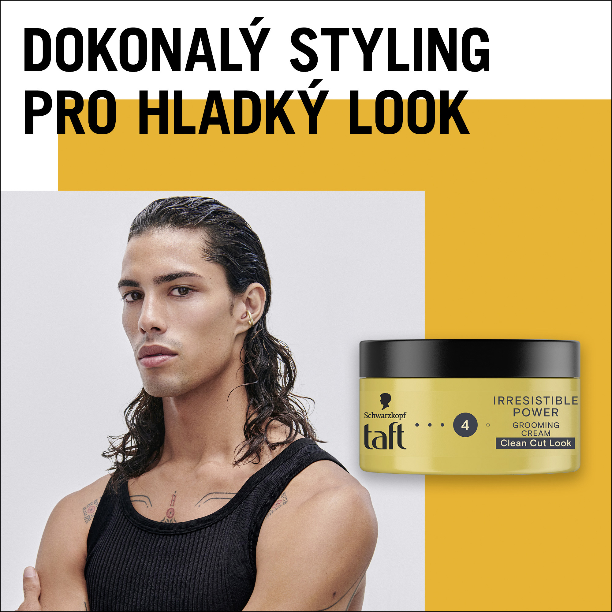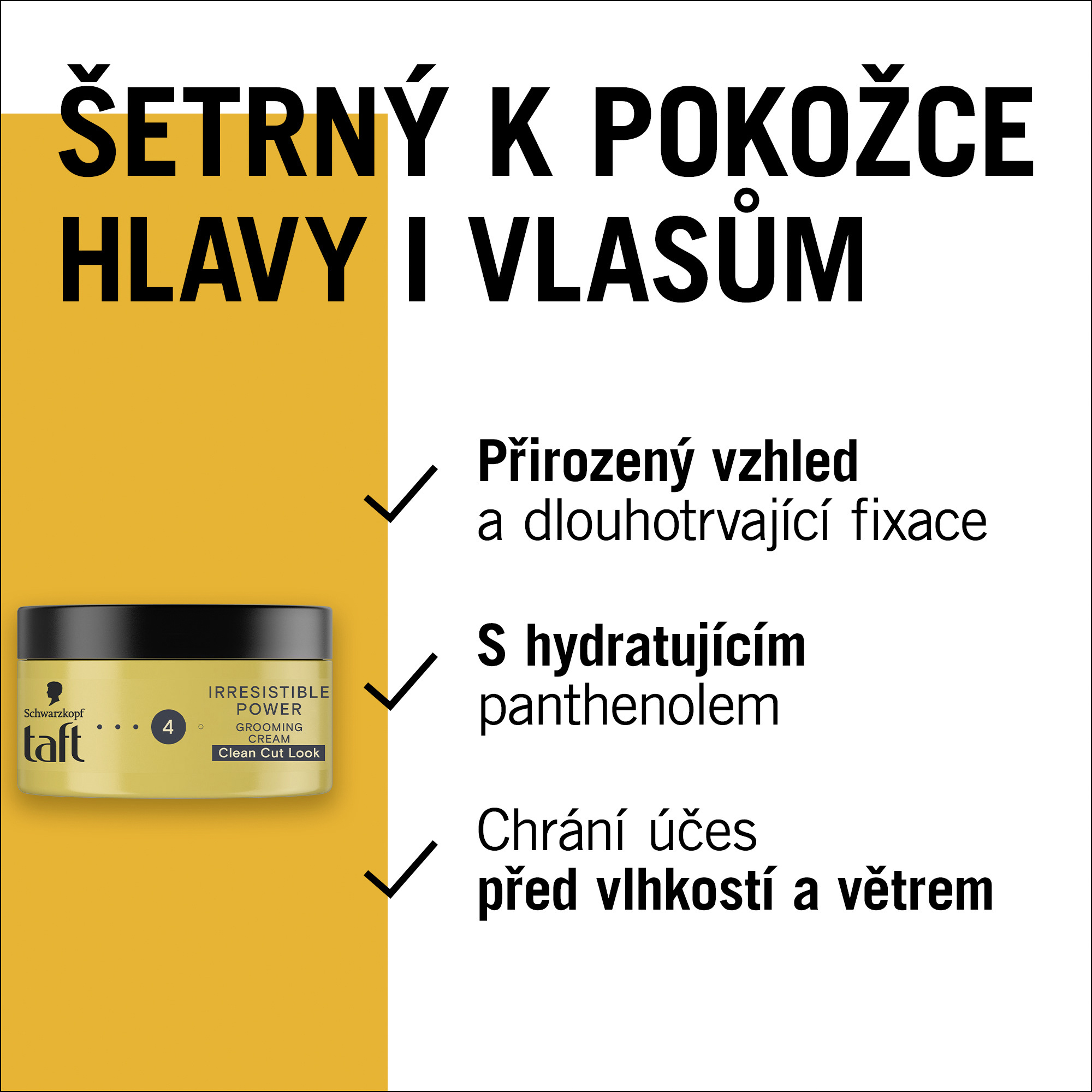 Schwarzkopf Taft stylingový krém Irresistible Power pro hladce upravený vzhled. Schwarzkopf Taft Irresistible Power poskytuje přirozený vzhled a dlouhotrvající fixaci úrovně 4. Zároveň je šetrný k vlasům a pokožce hlavy díky hydratačnímu panthenolu. Tento pečující krém pomáhá chránit účes před vlhkostí. Stylingové přípravky Taft používají veganské složení a jsou schváleny organizací PETA.