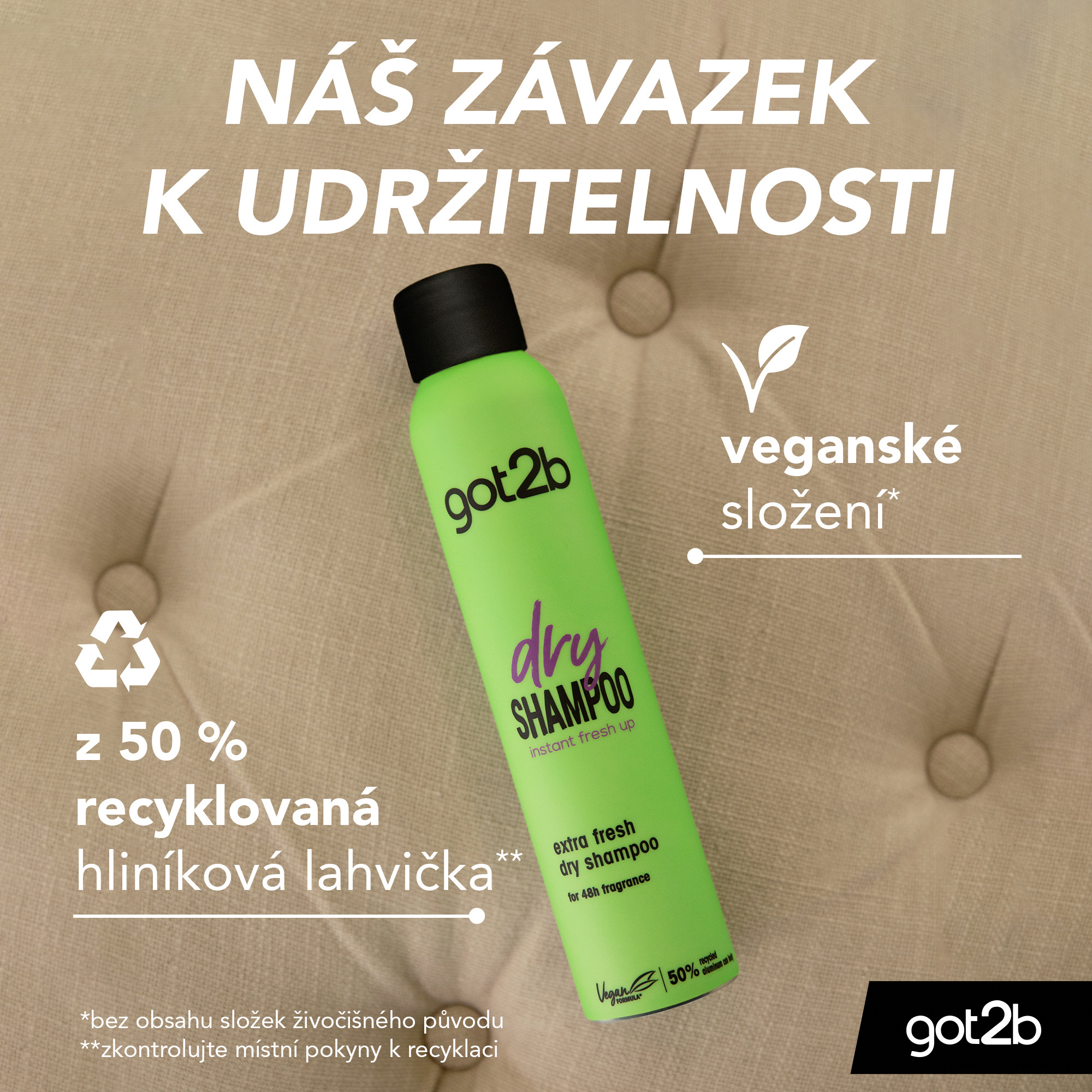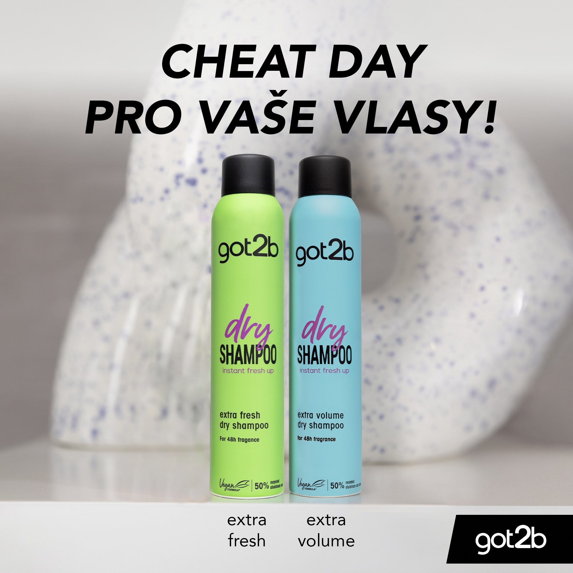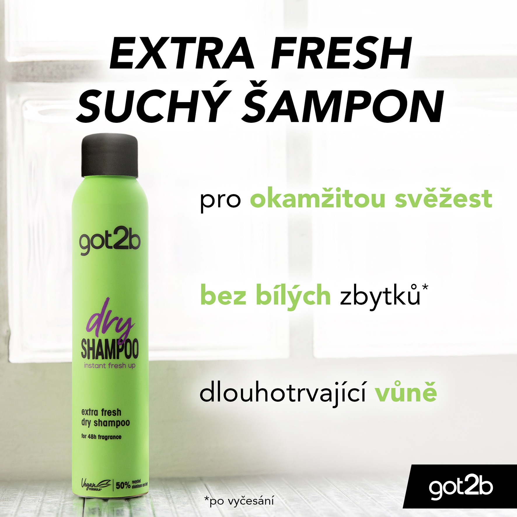 - got2b Extra Fresh suchý šampon čistí a osvěžuje tvé vlasy mezi dvěma umytími. Vychutnej si dlouhotrvající vůni a svěžest po dobu až 48h. Nezanechává bílé zbytky po vyčesání.