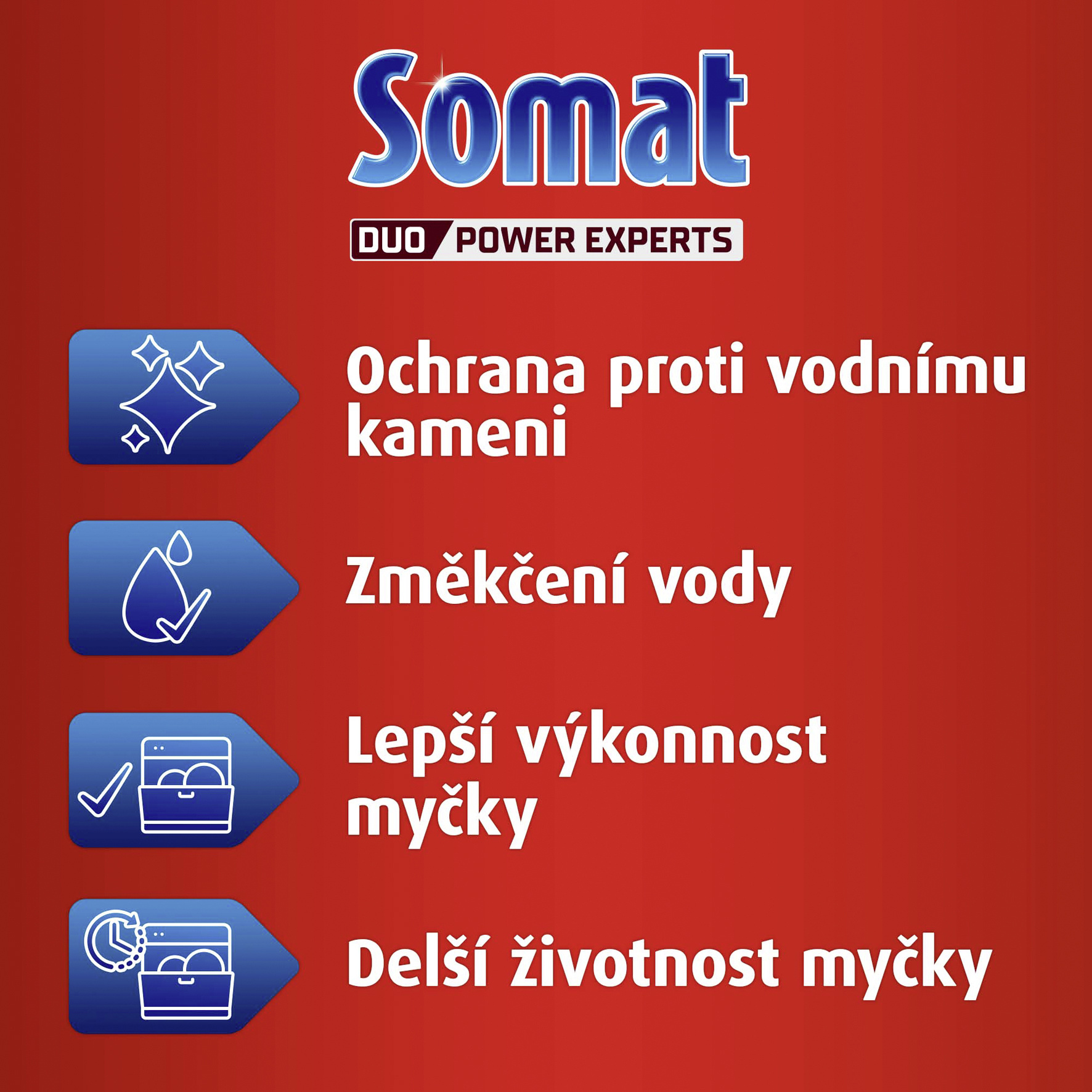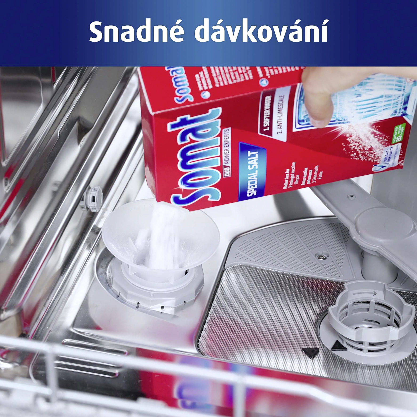 Voda z vodovodu obsahuje vodní kámen, který může zanechat zbytky na nádobí a uvnitř myčky nádobí. Se Somat speciální solí Duo Power Experts dokáže změkčovač vody v myčce odstranit vodní kámen z tvrdé vody a chránit tak před škodlivými usazeninami v ostřikovacích ramenech a trubkách myčky. Tento odstraňovač vodního kamene do myček se díky použití hrubozrnné soli obzvláště snadno dávkuje a postupem času zlepší výkon myčky. Navíc je Somat speciální sůl dodávána v 80% recyklované papírové kartonové krabici pro čistší svět.