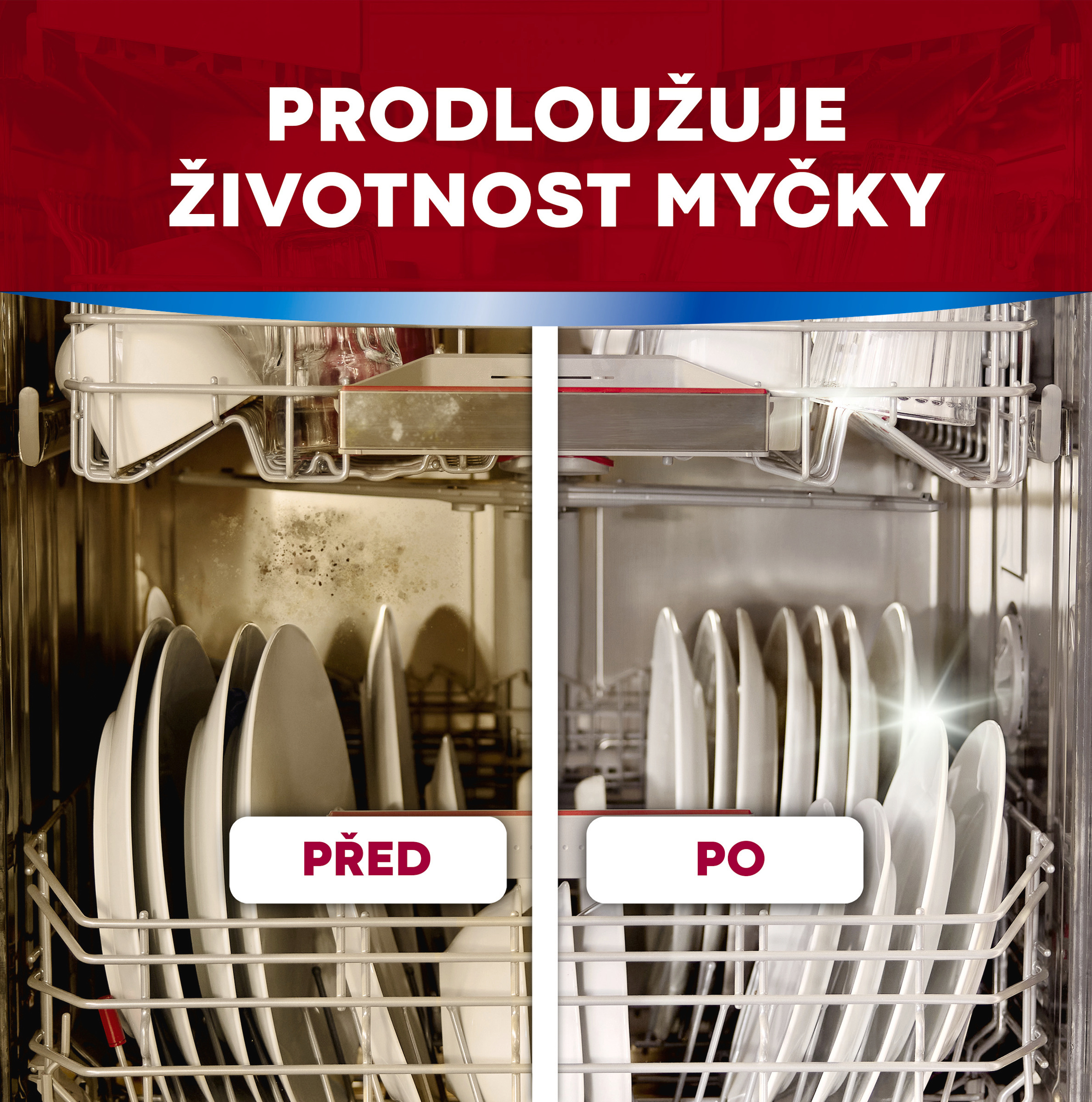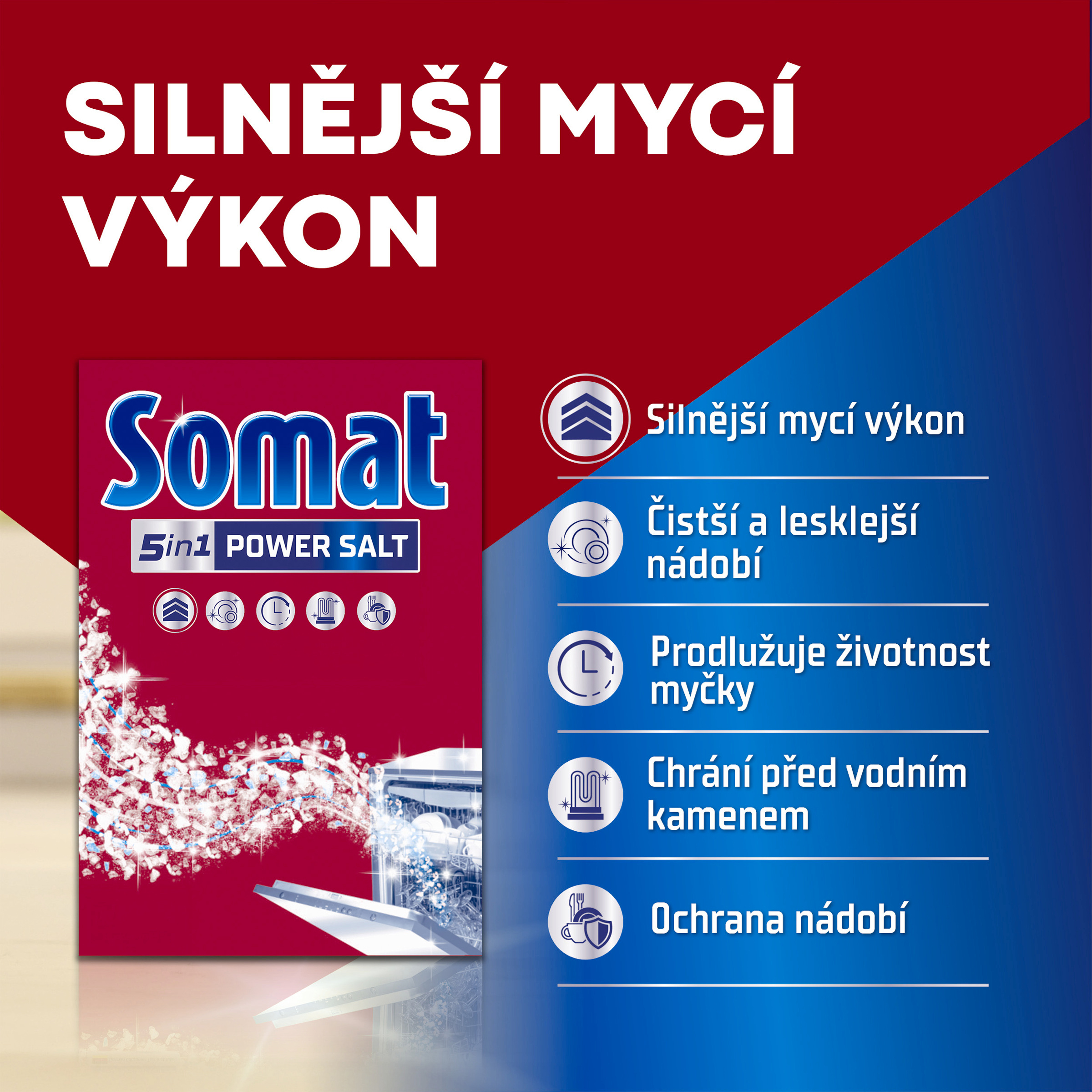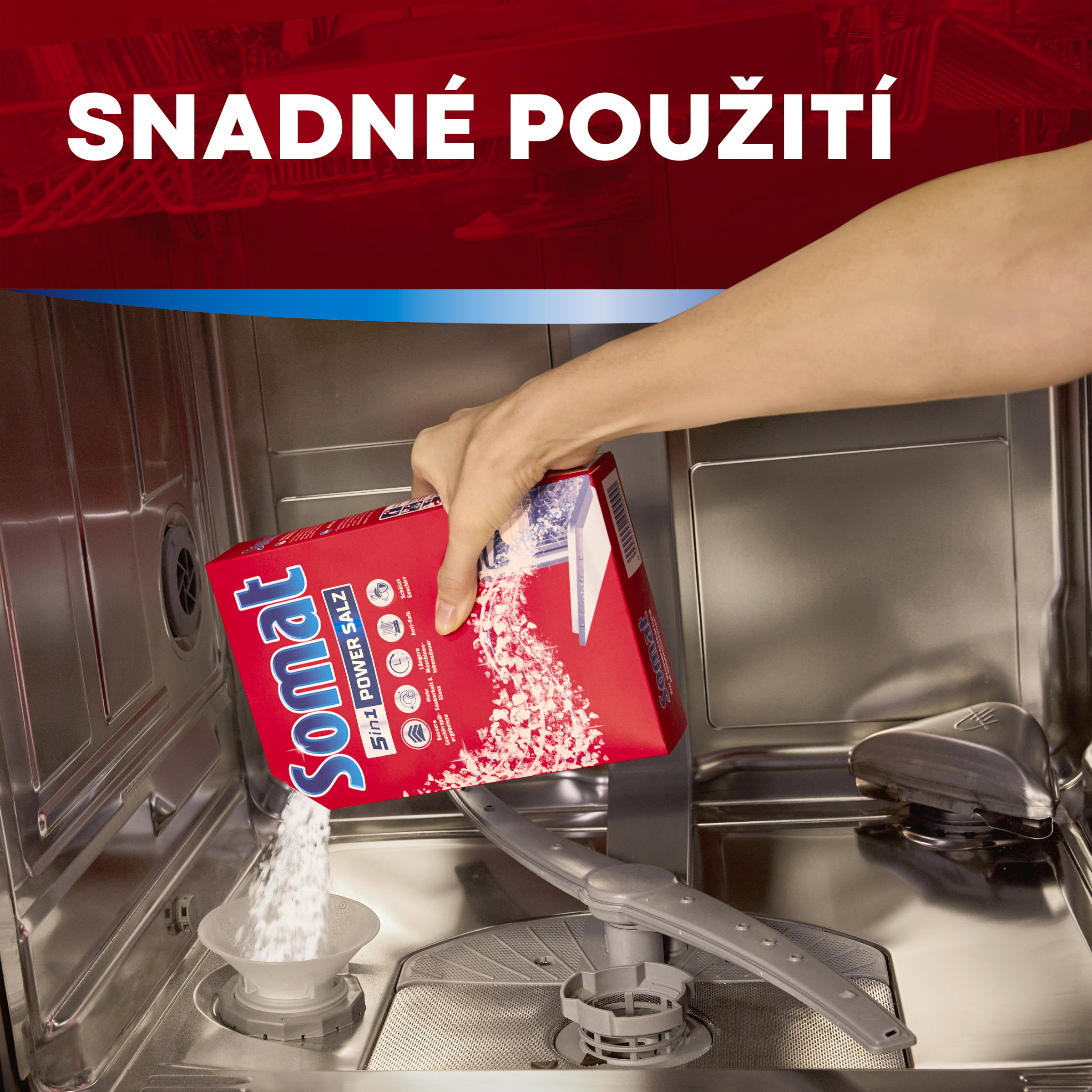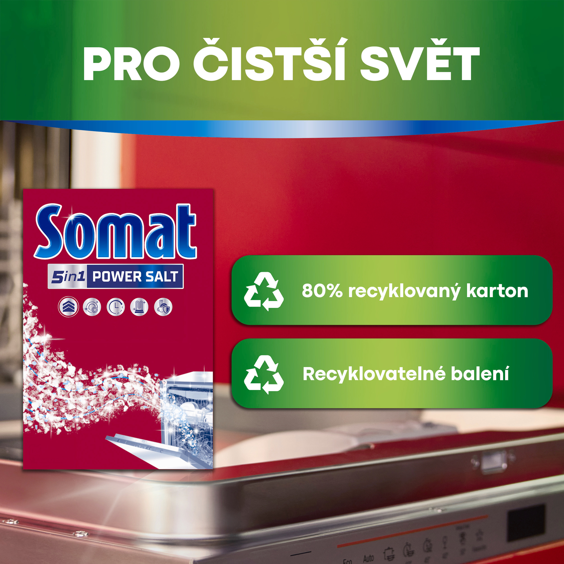 Voda z vodovodu obsahuje vodní kámen, který může zanechat zbytky na nádobí a uvnitř myčky nádobí. Se Somat speciální solí Duo Power Experts dokáže změkčovač vody v myčce odstranit vodní kámen z tvrdé vody a chránit tak před škodlivými usazeninami v ostřikovacích ramenech a trubkách myčky. Tento odstraňovač vodního kamene do myček se díky použití hrubozrnné soli obzvláště snadno dávkuje a postupem času zlepší výkon myčky. Navíc je Somat speciální sůl dodávána v 80% recyklované papírové kartonové krabici pro čistší svět.