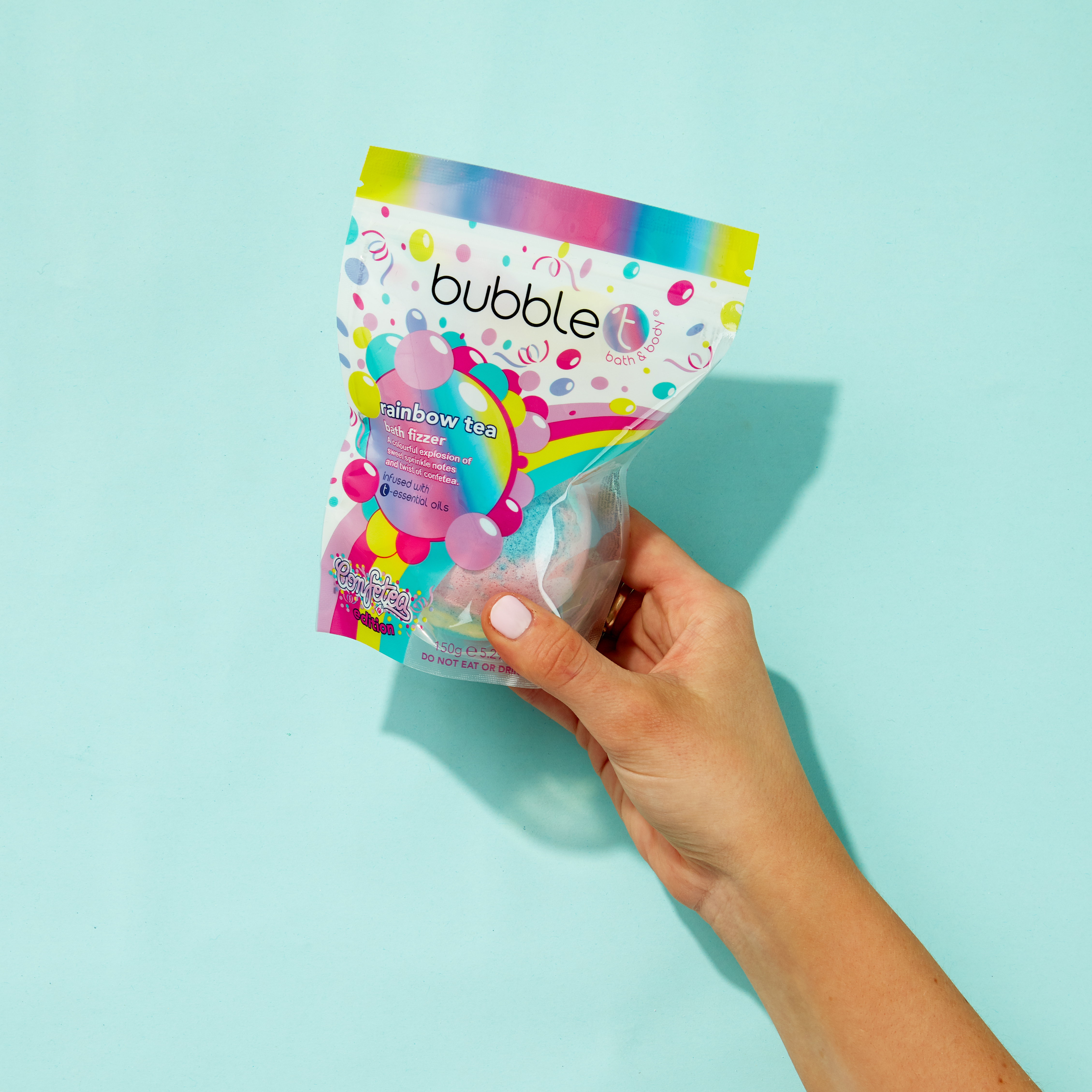 Veliká šumivá bomba do koupele je směs zábavných duhových barev s povznášejících vůní. Voní po pomerančích, jahodách, malinách, ostružinách a černém rybízu s přídavkem čajových tónů, jasmínu a smetanové vanilky. Fizzer rozpustíte ve vaně pod tekoucí vodou.