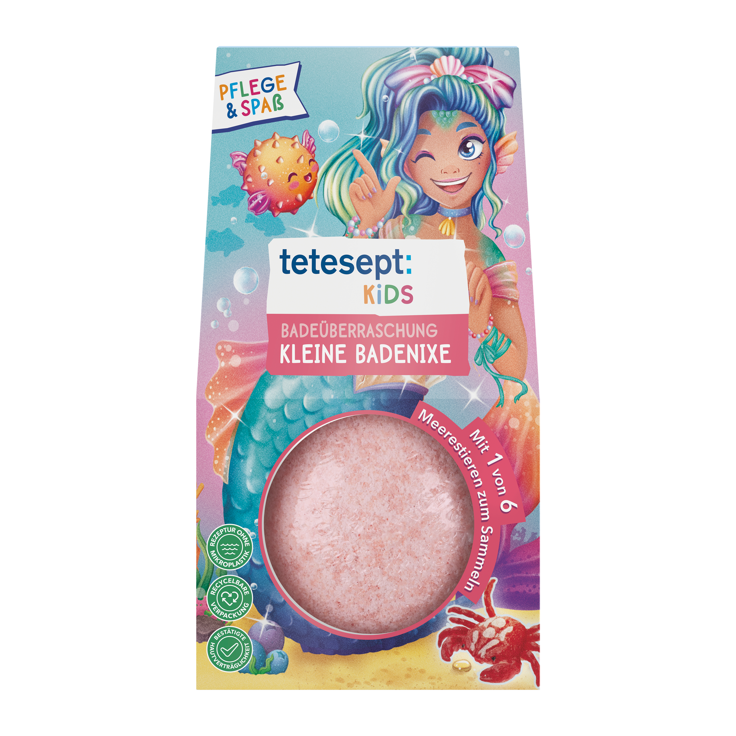 Malá mořská víla obsahuje složení speciálně přizpůsobené citlivé dětské pokožce, s pečujícím olejem z hroznových semínek a avokádovým olejem. Navíc obarví vodu na růžovo a provoní koupelnu ovocnou vůní lesních plodů. Uvnitř čeká jedno ze šesti veselých mořských zvířátek.