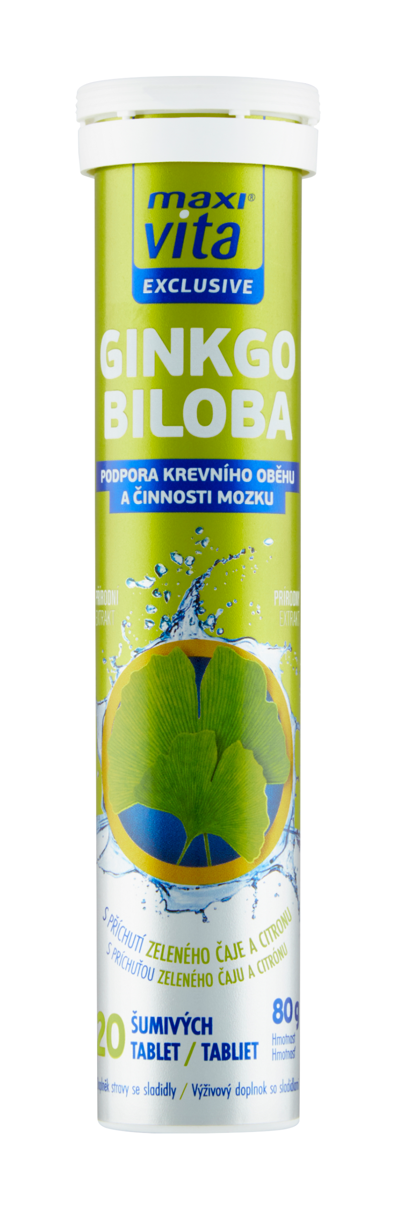 Šumivé tablety ginkgo biloba s příchutí zeleného čaje a citronu, doplněk stravy
