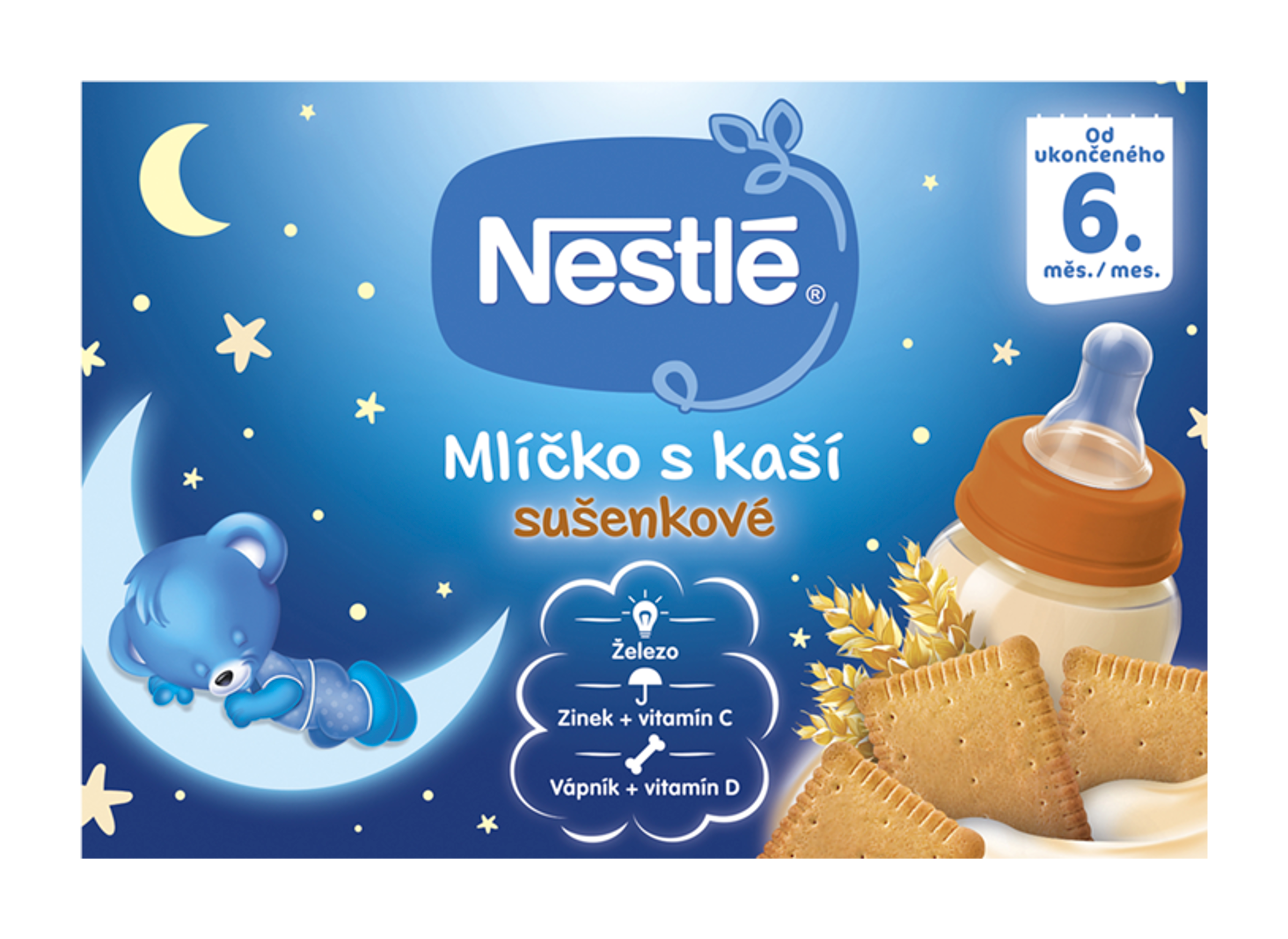 Hotový mléčno-obilný příkrm pro kojence od ukončeného 6. měsíce. Plně pokrývá hlavní denní jídlo kojence (snídani, oběd či večeři). Rozdělený na několik menších porcí je ideální i jako svačinka kdykoliv během dne. Díky unikátní technologii enzymatického štěpení škrobů je mlíčko s kaší lehce stravitelné a má přirozeně sladkou chuť.