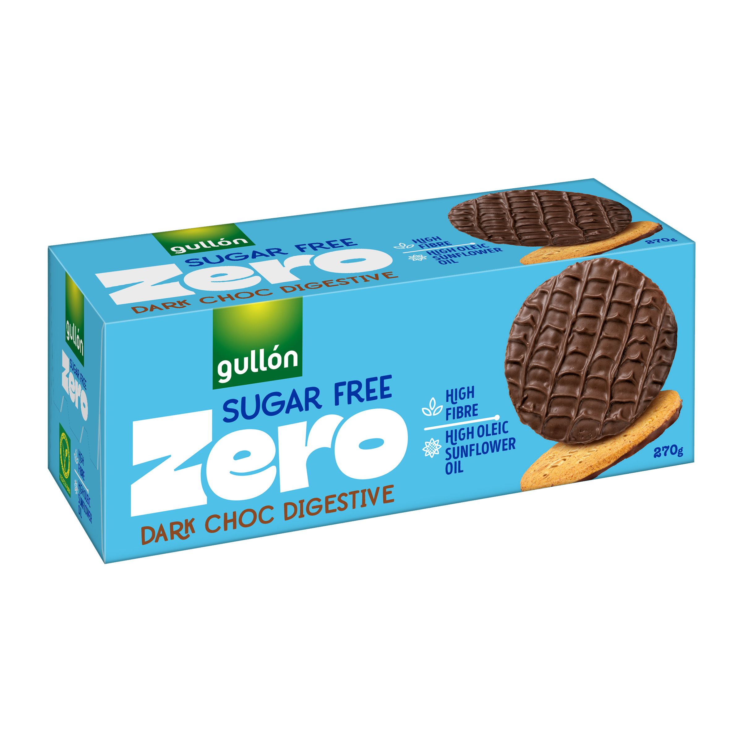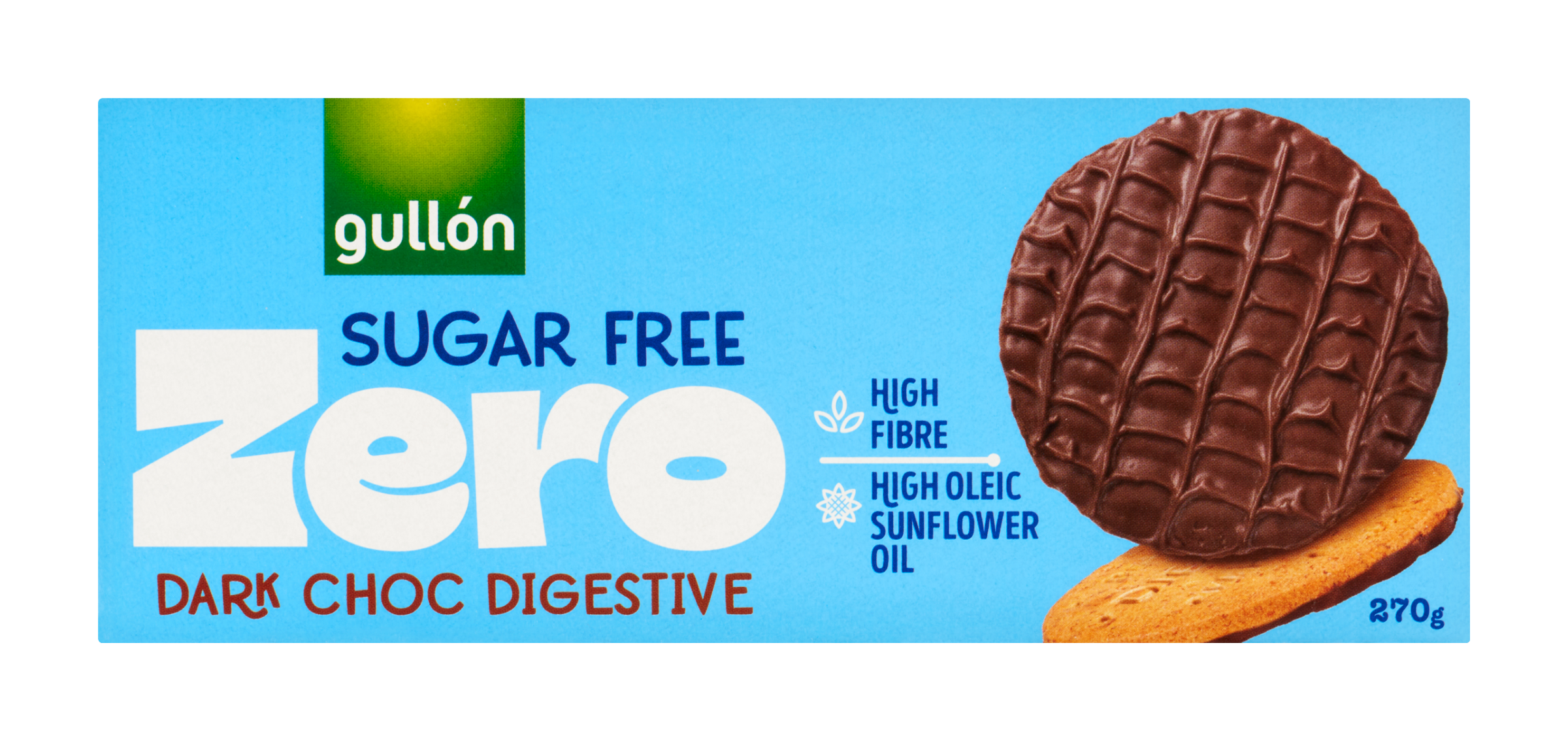 Gullón Digestive – Celozrnné pšeničné sušenky polomáčené v tmavé čokoládě, bez cukru, se sladidly.