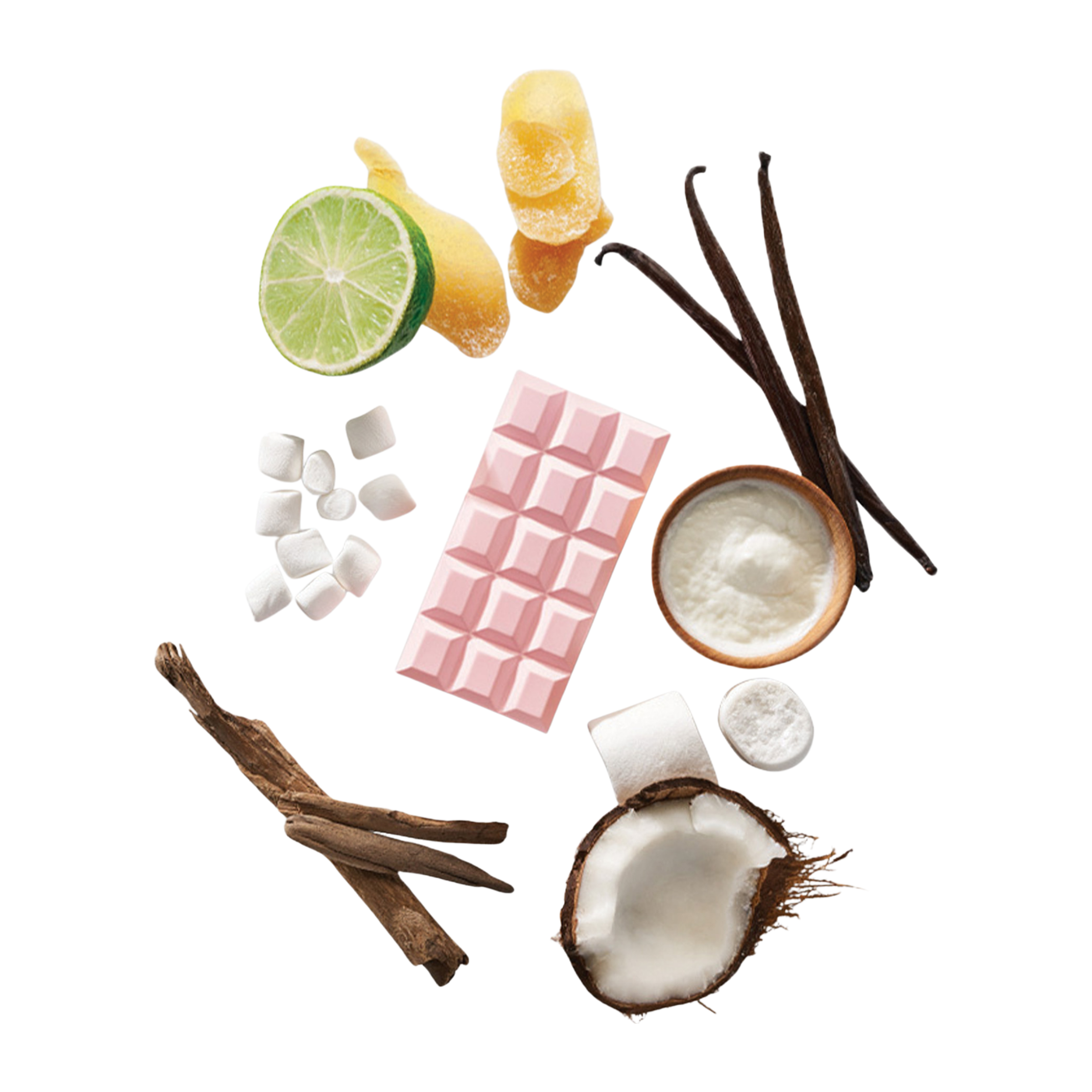 Srdce: okvětní lístky jasmínu, kokosové mléko, vanilka z Madagaskaru