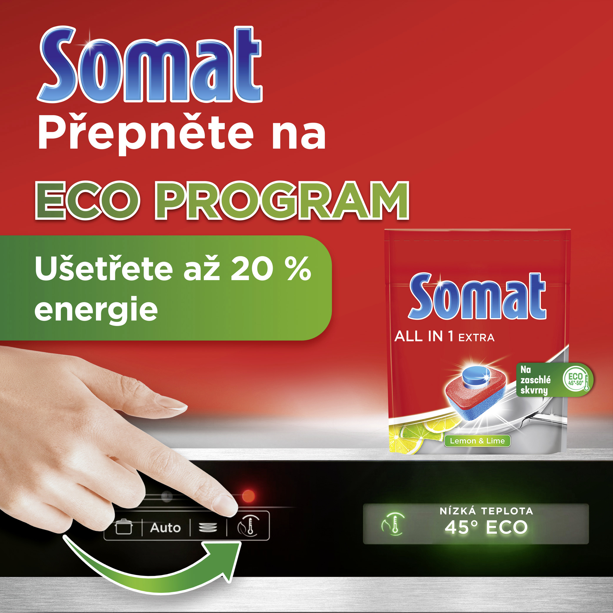 Značka Somat se rovněž zasazuje o čistší svět: náš závod pracuje se 100% obnovitelnou elektřinou a z naší výroby se nevyváží žádný odpad na skládky. Tablety do myčky Somat All-in-1 Extra jsou speciálně vyvinuty pro krátké a eco programy s nízkou teplotou. Přepněte program a ušetřete vodu a až 20 % energie* se Somatem! *Přechodem z normálního programu na krátký či eco program s nízkou teplotou můžete ušetřit vodu a až 20 % energie, přičemž dosáhnete vynikající čistoty a lesku. Pro méně špinavé nádobí zvolte krátký program s nízkou teplotou a pro běžně špinavé nádobí zvolte eco program s nízkou teplotou. Naše výrobky Somat jsou speciálně navrženy pro oba programy. Vyvarujte se používání intenzivního, extra sušícího nebo časově úsporného programu, jako je "expresní/rychlý", protože to by mohlo vést k vyšší spotřebě vody nebo energie.