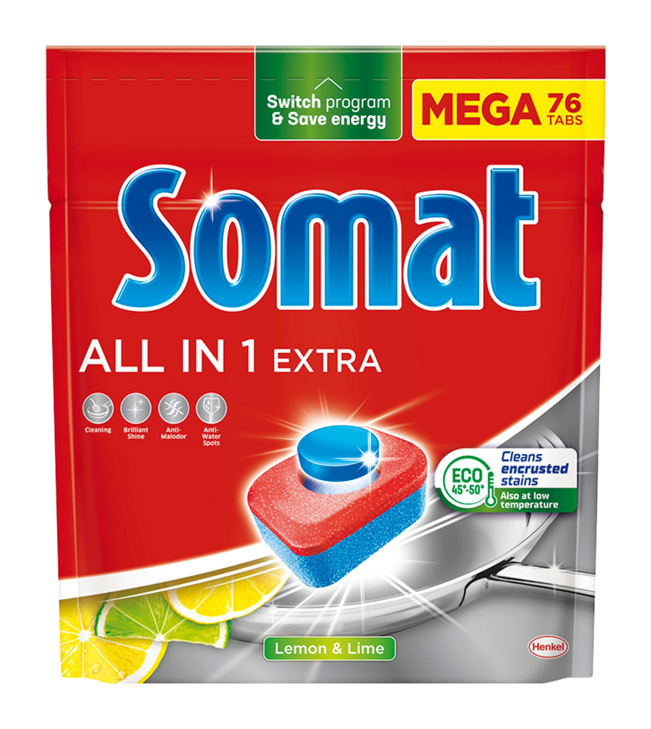 - PŘEPNĚTE PROGRAM A UŠETŘETE: Tablety na nádobí Somat All-in-1 Extra jsou určeny pro krátké a eco programy s nízkou teplotou. Vysoce aktivní složení efektivně myje nádobí i při nízkých teplotách a šetří energii až o 20 %.