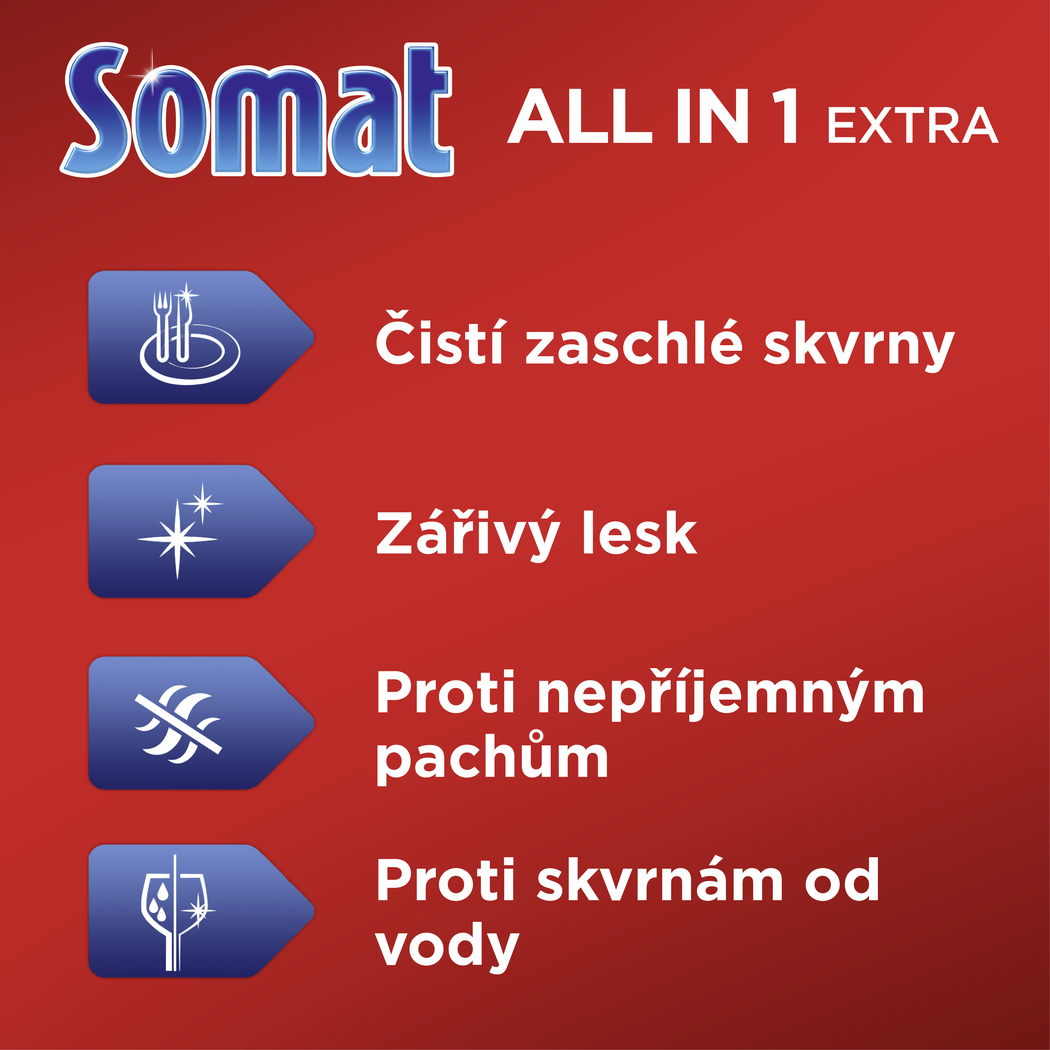 Somat All-in-1 Extra tablety do myčky pro zářivě čisté nádobí i na krátké a eco programy s nízkou teplotou! Vyzkoušejte účinnou mycí sílu s tabletami do myčky Somat All-in-1 Extra. Jejich silné a rychle působící složení se vypořádá se zaschlými zbytky jídla a rozpustí skvrny od čaje a kávy, a to i na krátké programy s nízkou teplotou. Tablety Somat All-in-1 Extra jsou určeny k použití na všechny talíře, sklenice, hrnky, láhve, stříbrné nádobí, příbory, hrnce a pánve vhodné do myčky. S tabletami do myčky Somat jsou nádobí a sklenice po každém mytí dokonale čisté, a to i při použití ekologického programu s nízkou teplotou.
