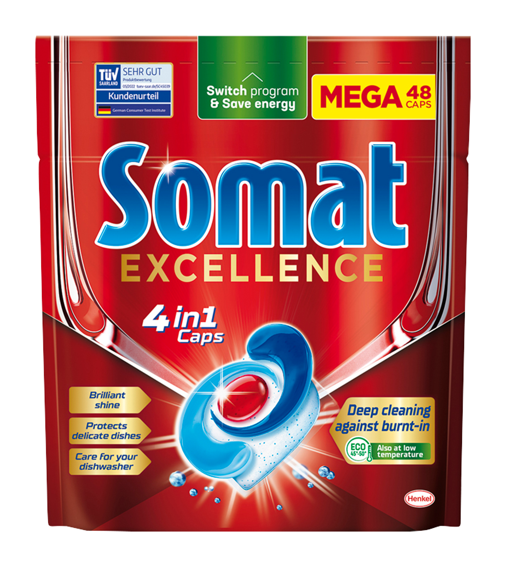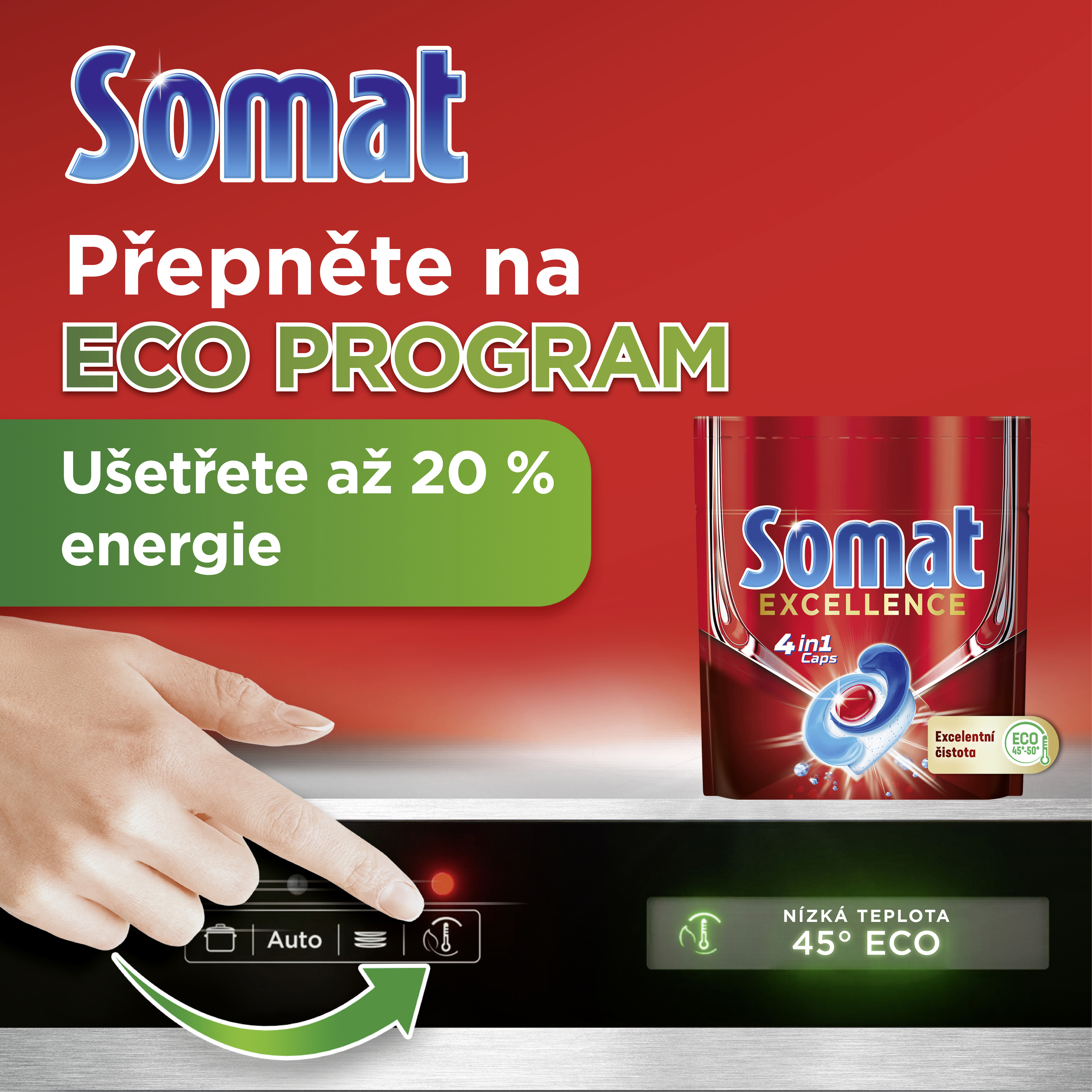 Somat Excellence: Účinné 4v1 složení, které čistí a poskytuje lesk Somat Excellence 4v1 kapsle na mytí nádobí obsahují prémiový multifunkční prostředek na mytí nádobí vyrobený z prášku v kombinaci se 3 jedinečnými pevnými gelovými komorami v biologicky odbouratelné fólii rozpustné ve vodě. Díky silnému složení, které působí proti odolným připáleninám, Somat Excellence kapsle do myčky nádobí jsou vhodné pro všechny talíře, sklenice, hrnky, láhve, hrnce, plasty a pánve vhodné do myčky. Tento prémiový prostředek do myčky nádobí nezanechává žádné zbytky ani zaschlé skvrny od vody, takže po ukončení mycího cyklu není nutné dodatečné leštění. Místo toho si můžete užít novou úroveň dokonale zářivého lesku! Přímo z myčky na váš stůl. Náš výrobní závod nyní pracuje se 100% obnovitelnou elektřinou a naše výroba má nulový dopad na skládky.