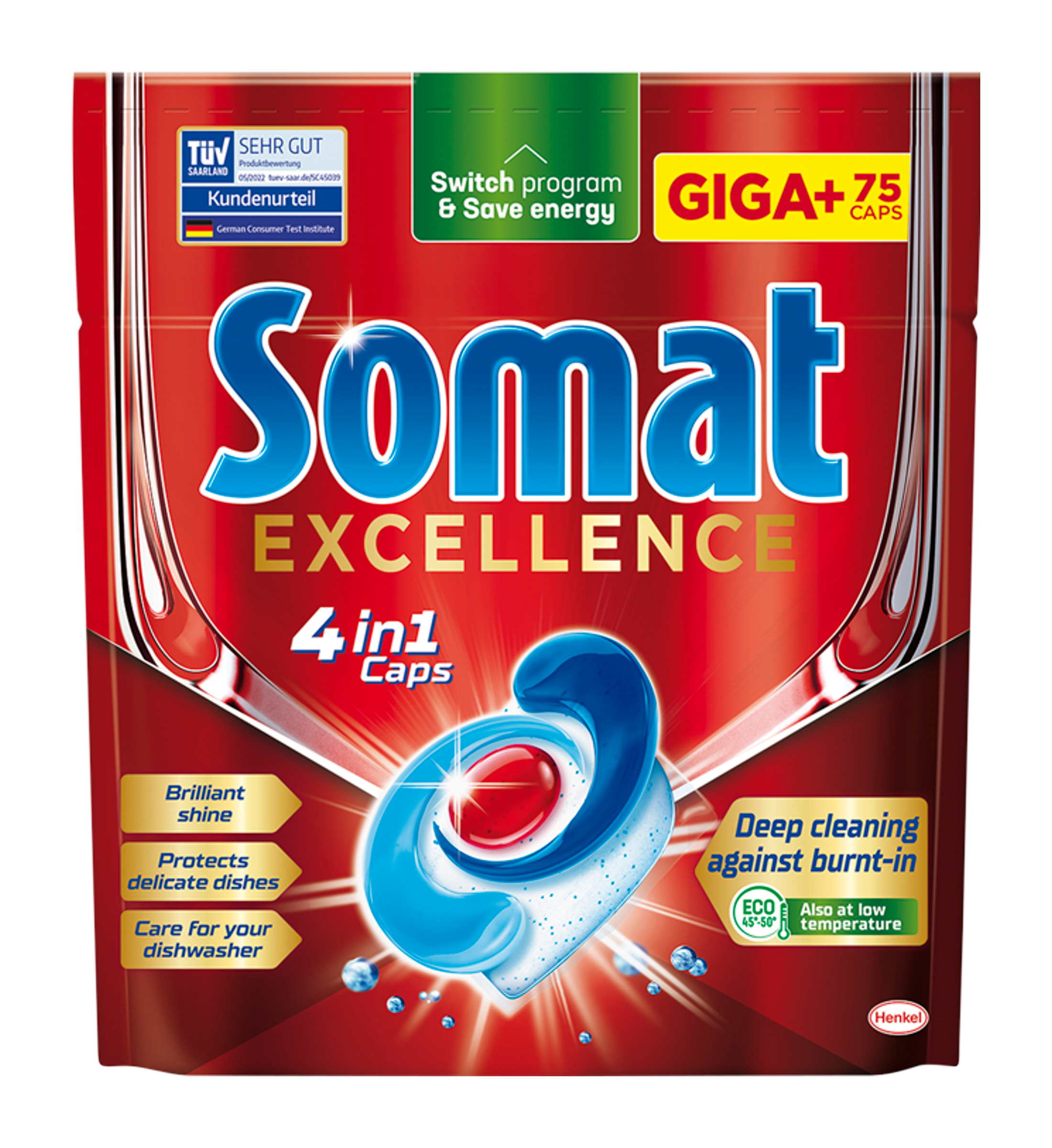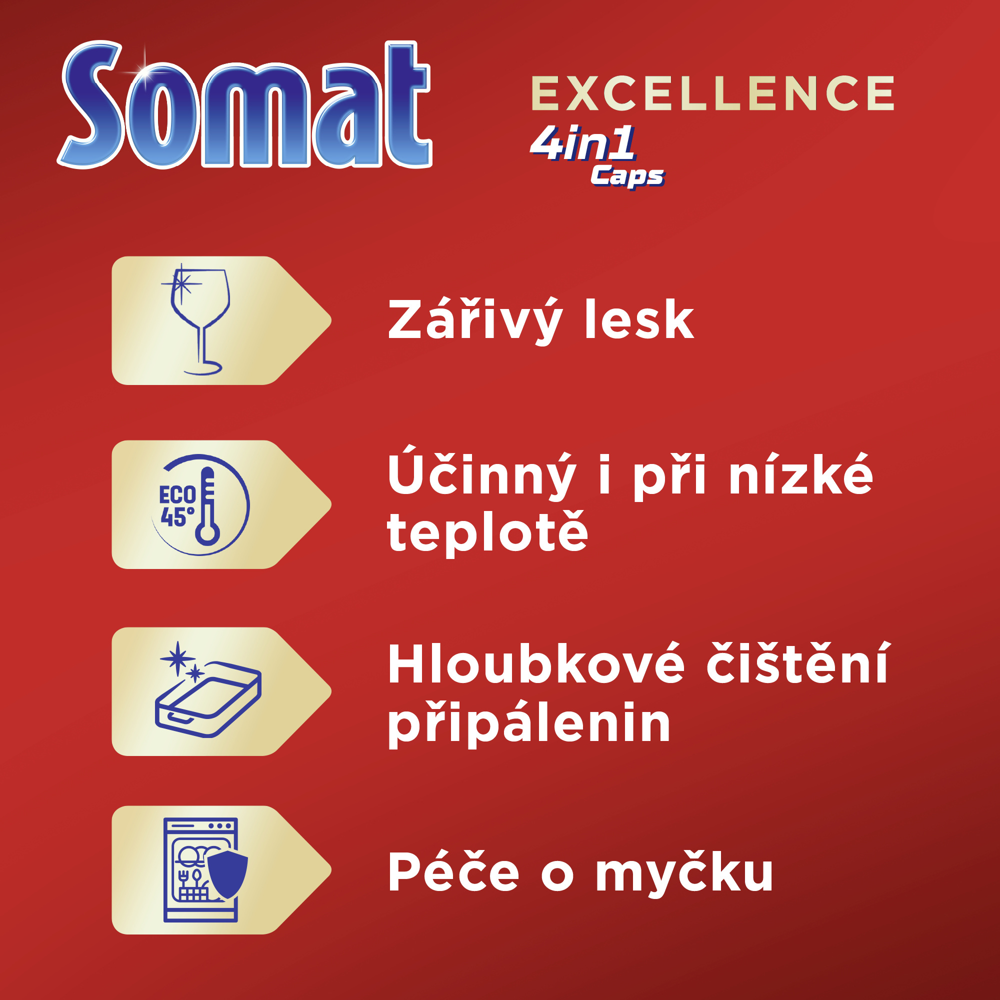 Somat Excellence kapsle 4v1 pro excelentní čistotu a lesk - i při nízkých teplotách na eco a krátké programy! Somat Excellence kapsle do myčky se rychle rozpouští a jsou složeny z prášku a 3 unikátních gelových komor v biologicky odbouratelné fólii rozpustné ve vodě. Jejich účinné složení zajišťuje hloubkové čištění připálenin, poskytuje dokonalý lesk, ochranu křehkého nádobí a pečuje o vaši myčku. Kapsle nezanechávají žádné zbytky ani zaschlé skvrny od vody, takže po ukončení mycího cyklu není nutné dodatečné leštění.