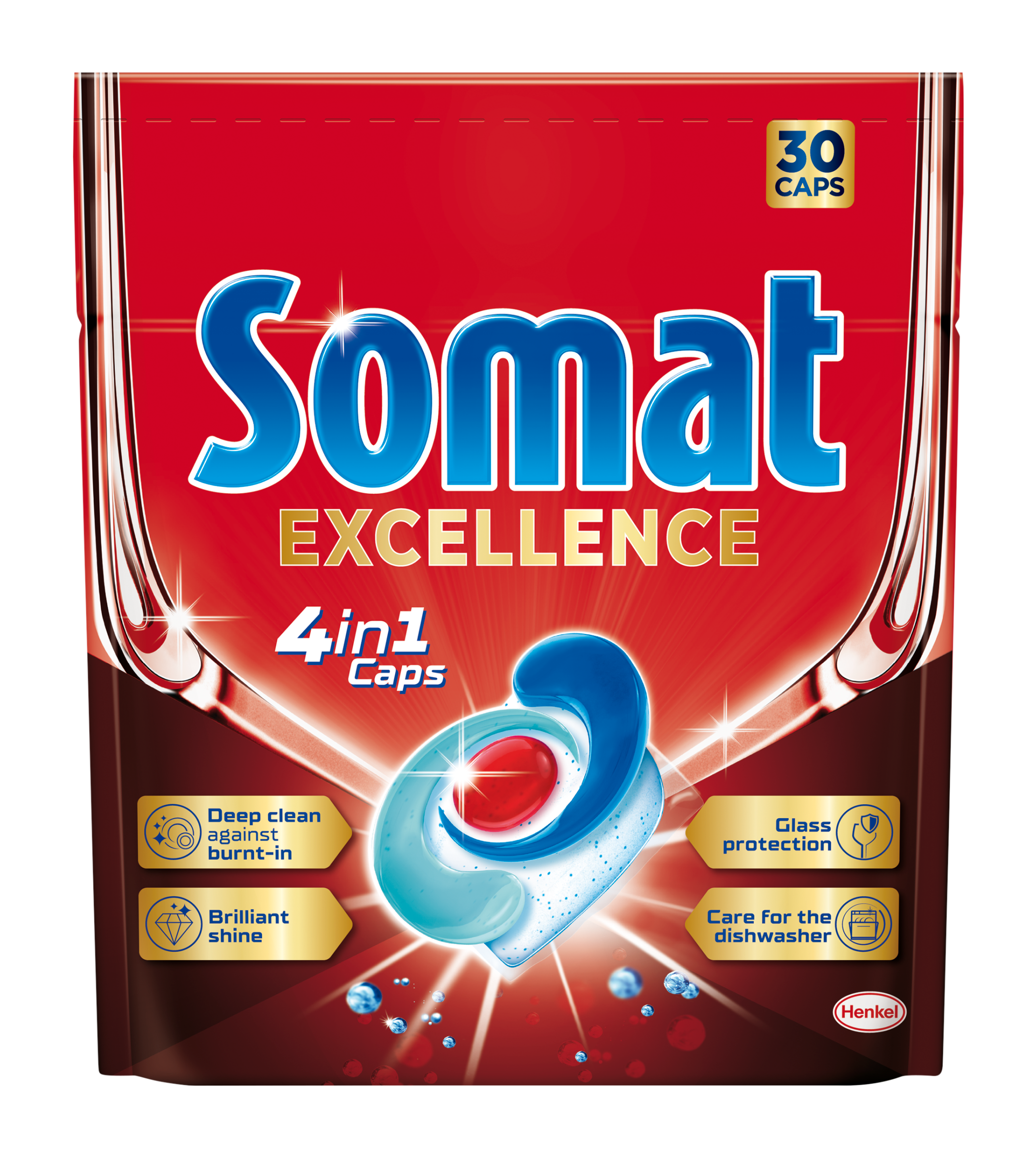 Tablety do myčky Somat Excellence 4v1 pro dokonalé čištění, zářivý lesk a šetrnou péči o nádobí i myčku! Složení tablet do myčky Somat Excellence 4v1 kombinuje 4 síly: hloubkové čištění pro rozpouštění připálených zbytků jídla a usazené mastnoty, žádné zaschlé stopy po vodě pro dokonalý lesk, ochranu choulostivého nádobí před korozí a péči o myčku. Rychle se rozpouštějící prémiové kapsle kombinují práškový mycí prostředek a 3 pevné gelové komory v biologicky odbouratelné a ve vodě 100% rozpustné fólii. Kapsle Excellence 4v1 mají silné enzymatické složení, které rozpouští připálené zbytky jídla, usazenou mastnotu a odolné skvrny, a to i na eco program s nízkou teplotou. Kapsle Somat jsou vhodné pro všechny talíře, sklenice, hrnky, láhve, hrnce, plasty a pánve, které lze mýt v myčce. Prémiový prostředek na mytí nádobí 4v1 nezanechává žádné zbytky ani zaschlé skvrny od vody, což znamená, že po skončení programu v myčce není třeba nádobí znovu mýt ani leštit. Užijte si zářivě čisté nádobí po každém mycím programu! Značka Somat se rovněž zasazuje o čistší svět: kapsle mají biologicky odbouratelnou a ve vodě rozpustnou fólii. Náš závod navíc pracuje se 100% obnovitelnou elektřinou a z naší výroby se nevyváží žádný odpad na skládky.