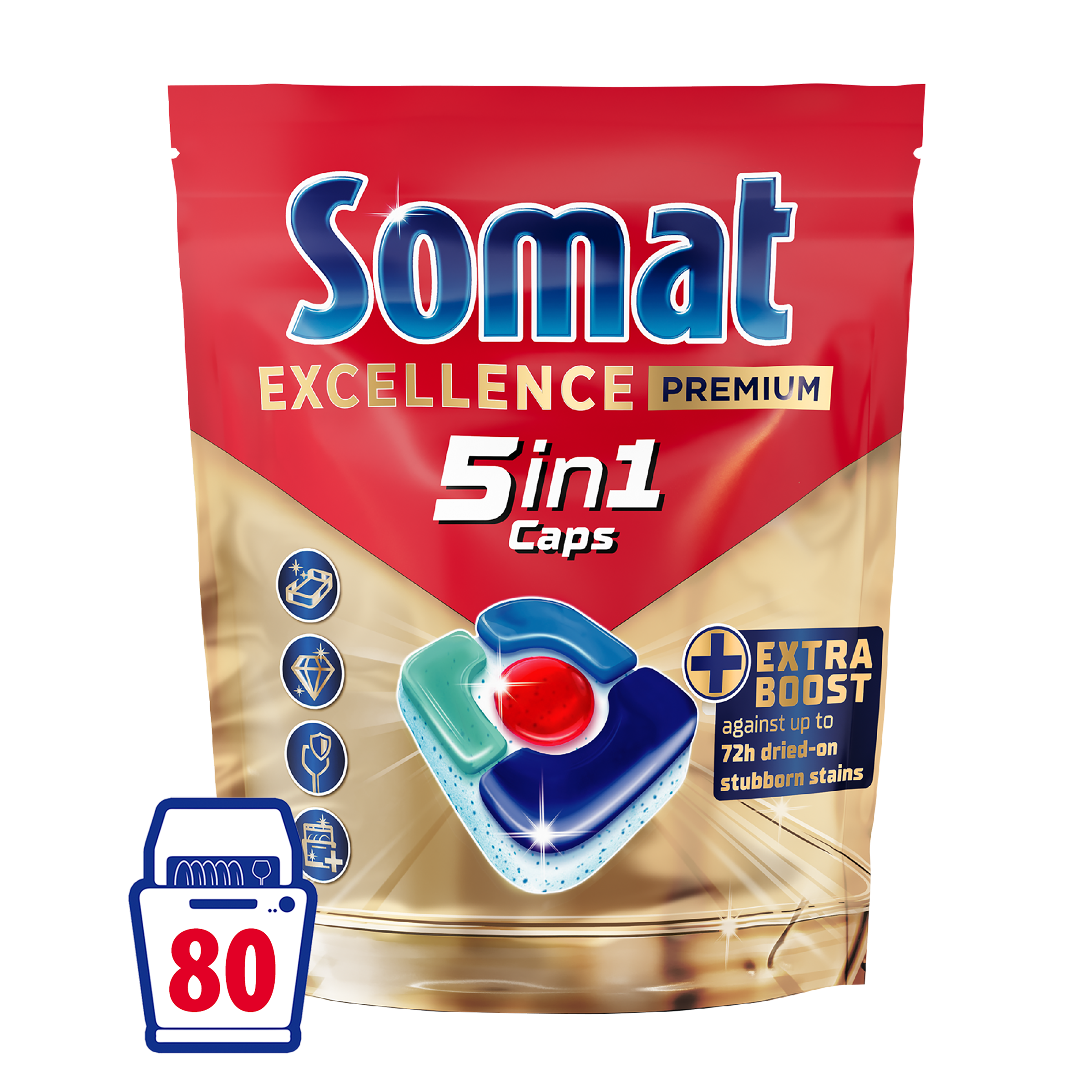 Somat Excellence 5v1 kapsle na nádobí - Navrženo tak, aby účinně odstraňovaly až 72 hodin zaschlé odolné skvrny a zajistily hloubkově čistý výsledek. S kapslemi Somat Excellence na automatické mytí nádobí se můžete spolehnout, že všechno vaše nádobí, které lze umýt v myčce; od talířů; sklenic; hrnků; lahví; hrnců; plastového nádobí; až po pánve; bude účinně vyčištěno a zůstane beze skrvn. Toto nové složení snižuje nutnost ručního čištění. Somat nejenže klade důraz na vynikající čisticí výkon, ale také pečuje o dlouhou životnost vaší myčky a vašeho nádobí. Kapsle do myčky Somat Excellence 5v1 jsou speciálně navrženy pro krátké mycí programy a také pro ekologické cykly při nízkých teplotách. Přepněte program a ušetřete vodu a až 20 % energie se Somat.
