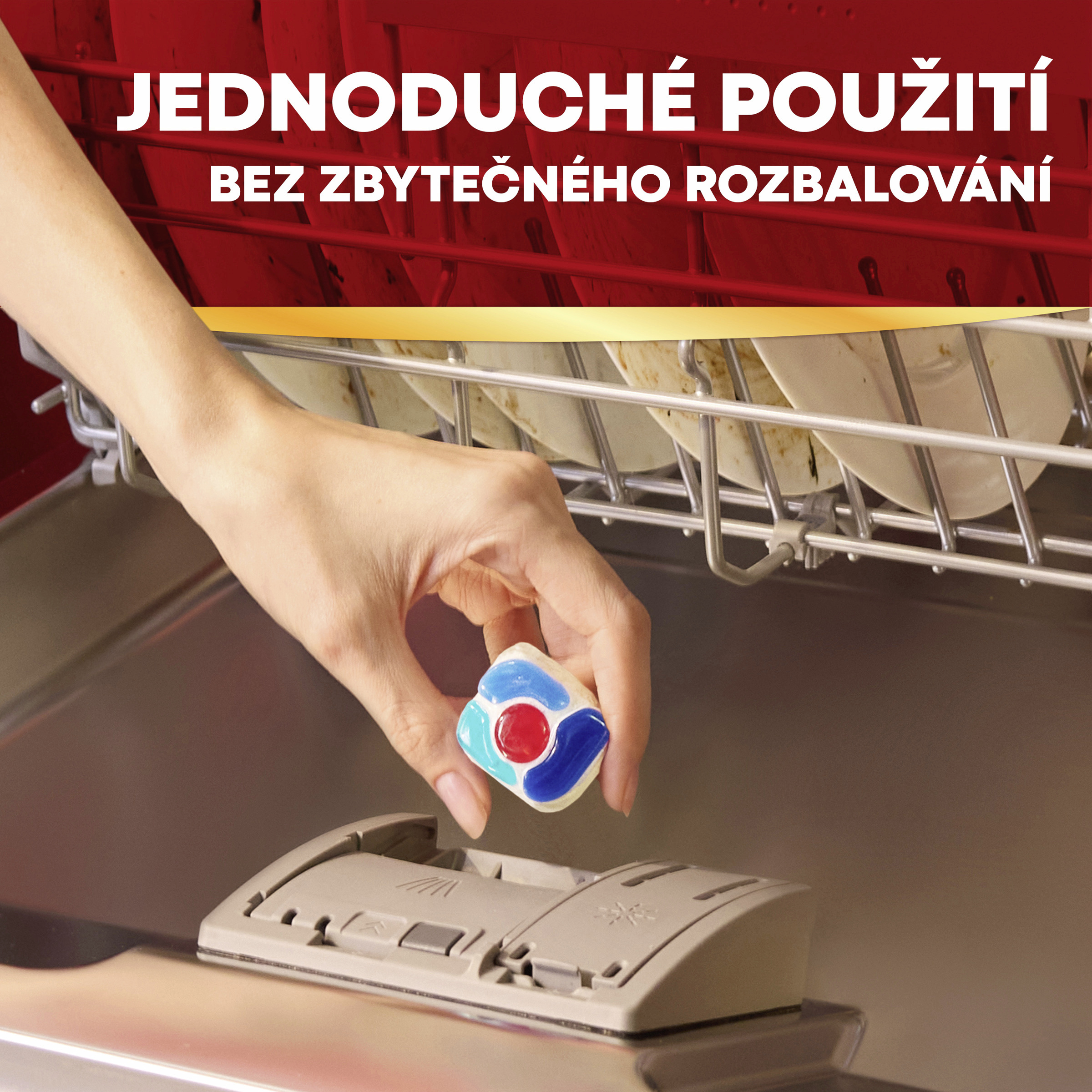 Jak používat: 1. Naplňte myčku nádobí. 2. Fólii rozpustnou ve vodě není třeba z kapsle odstraňovat, protože se zcela rozpustí. 3. Vložte předdávkovanou tabletu mycího prostředku přímo do dávkovací komory myčky. 4. Nevkládejte tabletu do koše na příbory, do zásobníku na sůl, ani do myčky nádobí. 5. Spusťte naplněnou myčku nádobí na požadovaný program.