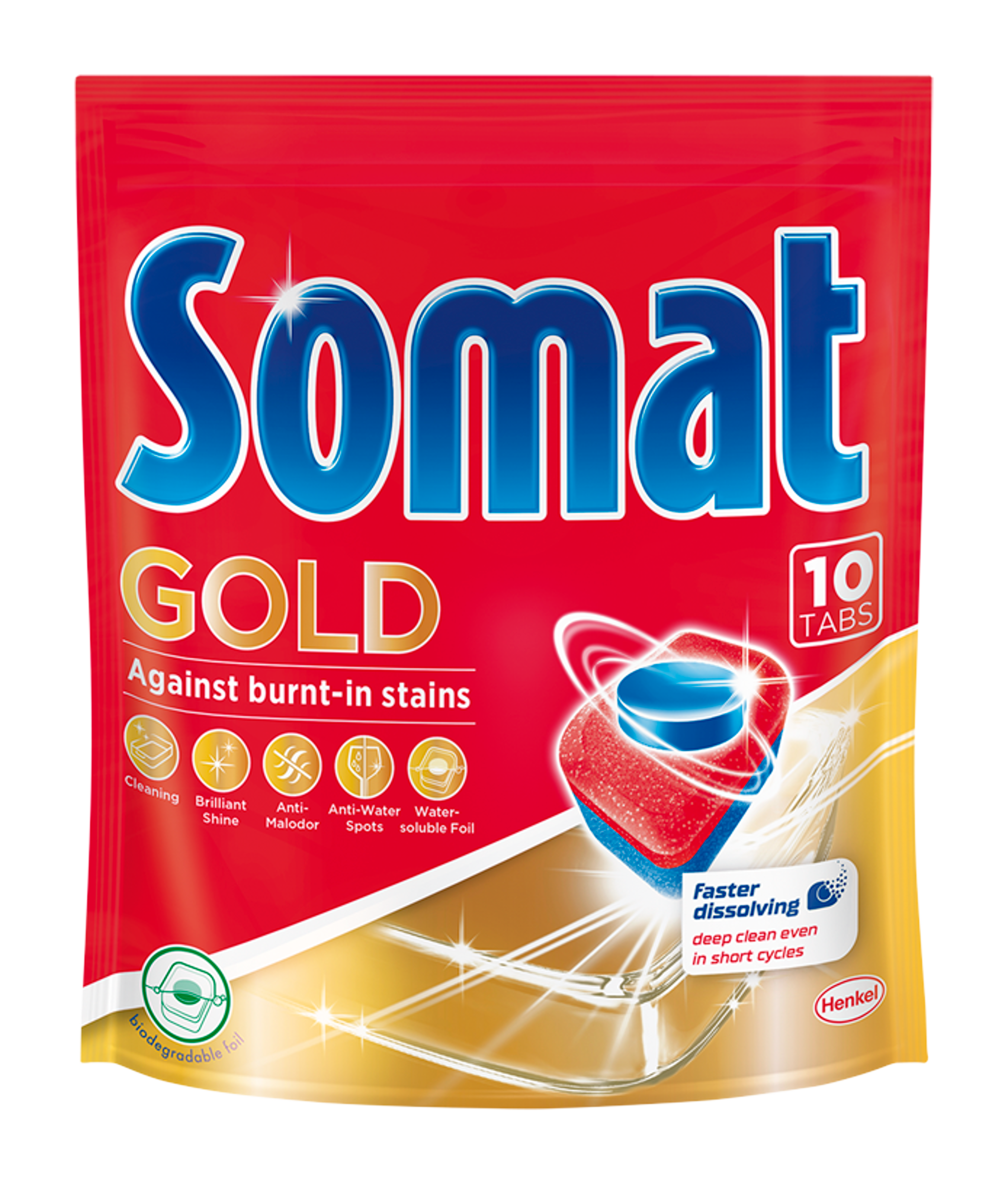 Žádné dávkování, žádné předmáčení, žádná péče po umytí! S tabletami do myčky Somat Gold zažijete silnou a efektivní čisticí sílu. Rychle a účinně působící složení Somat Gold odstraní i ty nejodolnější a nejlepivější nečistoty, jakými jsou mastnoty, připáleniny nebo zaschlé jídlo, ale také skvrny od čaje a kávy. Tablety se rychle rozpouští a působí okamžitě, dokonce i při krátkých mycích cyklech a nízkých teplotách. Somat Gold tablety do myčky lze bezpečně použít na všechny talíře, sklenice, hrnky, láhve, stříbrné nádobí, příbory, hrnce a pánve vhodné do myčky. Somat Gold zanechá vaše nádobí a sklenice zářivě čisté po každém mycím cyklu.
