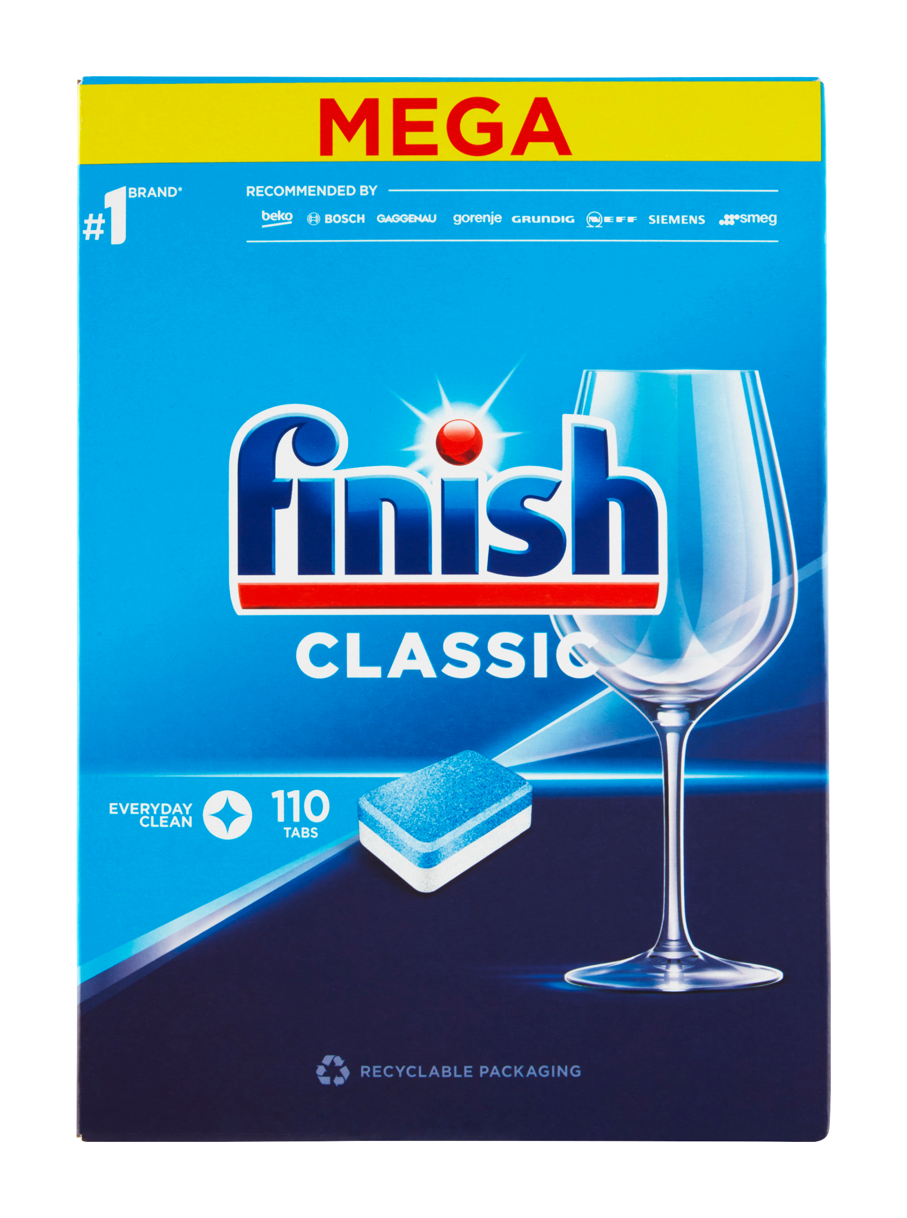 Připravte nádobí na účinnou sílu Finish Classic, která jej efektivně zbaví špíny. Zaschlé nečistoty odmočí a změkčí a čisticí látky je pak nemilosrdně odstraní. Dokonale si poradí i s tou největší mastnotou nebo připáleninami. Vyberte si každodenní čistotu pro Vaše nádobí v podobě tablet nebo prášku Finish Classic. Pro zajištění nejlepších výsledků doporučujeme použít Finish sůl a leštidlo. Myčka nádobí oproti mytí v ruce spotřebovává několikanásobně méně energie. Tím šetří náš čas, peníze, a hlavně díky ní zbytečně neplýtvá vodou z naší přírody. Pro dokonalé mycí výsledky ale potřebuje správný mycí prostředek. Tím jsou tablety nebo prášek do myčky Finish Classic. Díky jejich čisticí síle se na skvělý každodenní výsledek mytí nádobí můžete spolehnout. Spotřebu vody proto raději nechte na samotné myčce. Stačí ji otevřít, vložit do ní špinavé nádobí a přidat Finish Classic. Pak už si jen můžete užívat radost z čistého výsledku.