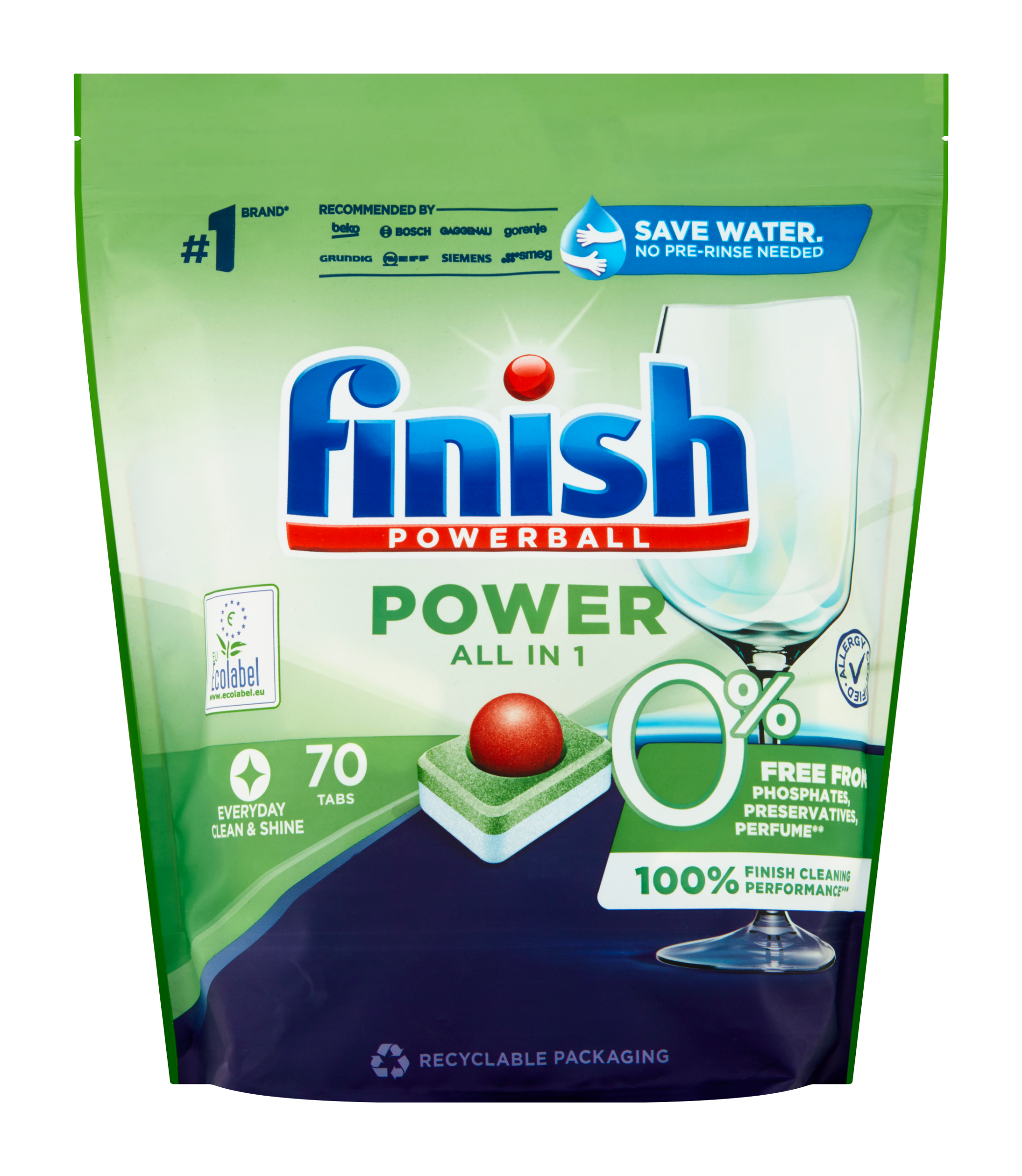 Finish Power 0 %, vše v jednom řešení pro vaše nádobí. 100% síla čistoty, s alergologickou certifikací - bez látek, které nechcete: fosfáty, parfémy, konzervanty. Powerball posiluje čisticí sílu pro každodenní čistotu a lesk hned napoprvé. Obsahuje (> 80%) biologicky odbouratelných složek. S rostlinnými složkami. S biologicky rozložitelným, ve vodě 100% rozpustným obalem. Přestaňme nádobí předmývat a šetřeme tak vodní zdroje! Ponechejte na své myčce a síle složení Finish Power 0%, aby se postaraly o špinavé nádobí.