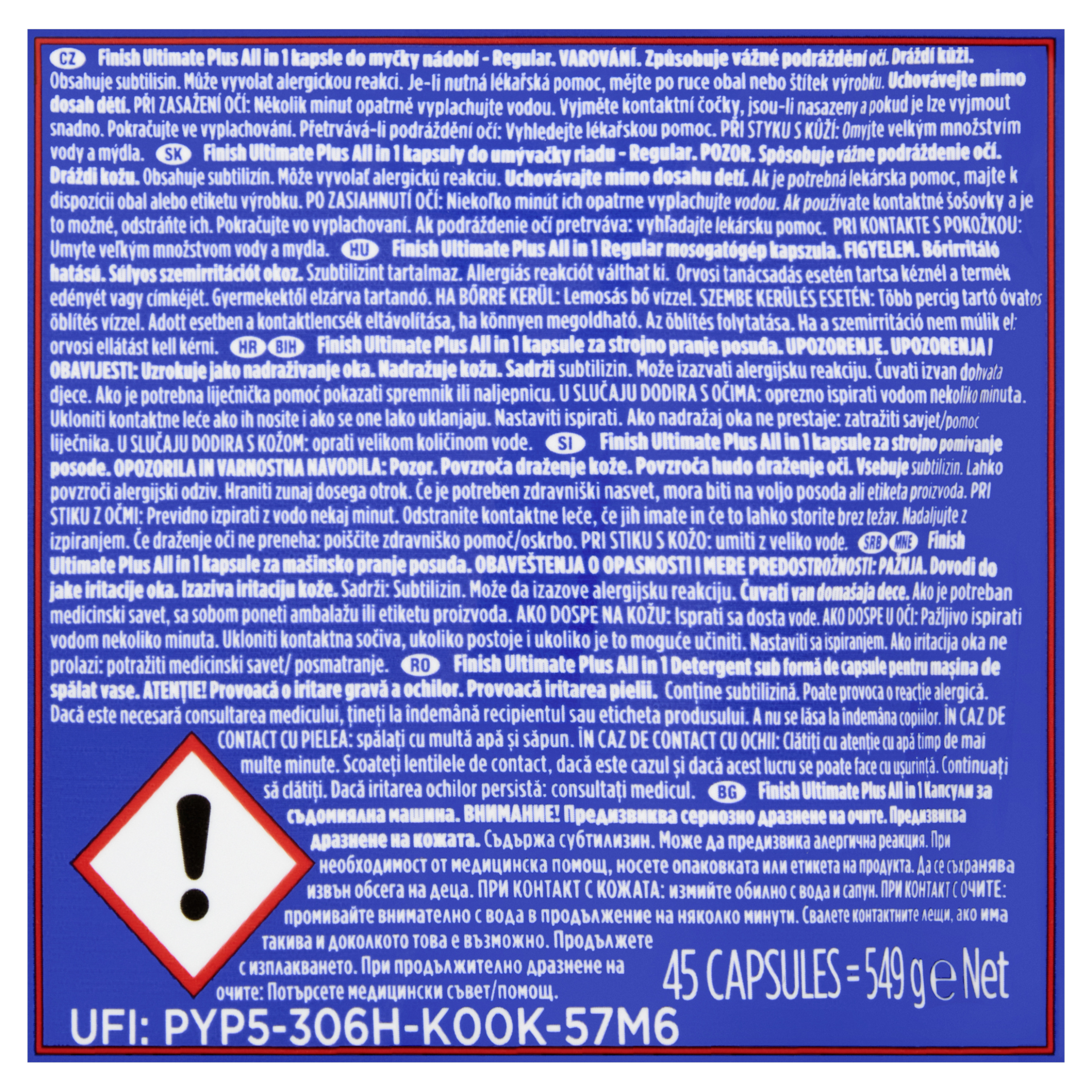 Tablety Finish Ultimate Plus All in 1 pro intenzivní čištění a diamantový lesk vždy hned napoprvé. Jedná se o vůbec první kapsli s technologií Cyclesyncᵀᴹ, která uvolňuje tu správnou složku*** ve správný čas. Pokročilé složení si poradí i s odolnými skvrnami bez nutnosti předmývat a přináší 4 akce v průběhu celého mycího cyklu. Kapsle chrání a pečují o skleněné nádobí a příbory a udržují jejich lesk s každým mytím. Náš revoluční výkon s o 15 % nižší hmotností chemikálií v porovnání s tabletami Finish Power All in 1. Obsahuje pečující látky, které pomáhají chránit vaše sklo před korozí a zakalením. Tento produkt nechrání před mechanickým poškozením ani neobnovuje již poškozené materiály.