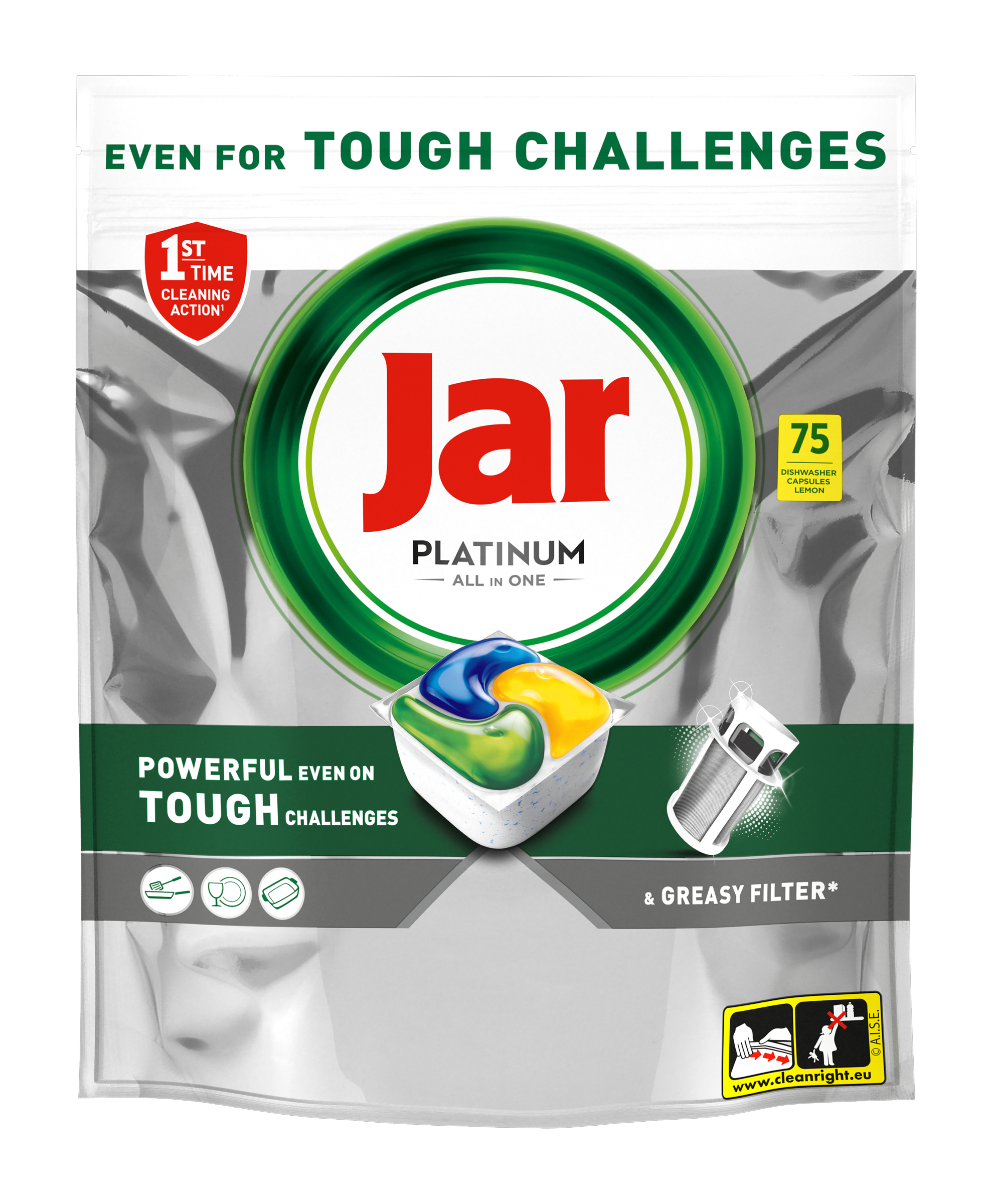 Tablety do myčky Jar Platinum Vše v jednom jsou účinné hned při 1. umývaní a dokážou si poradit i s těmi nejodolnějšími nečistotami, aby vaše nádobí zářilo čistotou. Tablety Jar Platinum mají čisticí sílu, díky které se nemusíte bát cokoliv uvařit. Můžete si být jistí, že vám pomohou vyčistit i mastný filtr myčky, aby vaše nádobí zářilo čistotou a myčka svěže voněla. Jar spojuje v jedné účinné kapsli tekutý i práškový prostředek na mytí nádobí. Vysoce rozpustný obal se rychle rozpouští, takže nádobí se začíná ihned umývat. A navíc se kapsle tak snadno používají. Kapsli není třeba rozbalovat a stačí ji jen vložit do dávkovacího zásobníku na mycí prostředek.